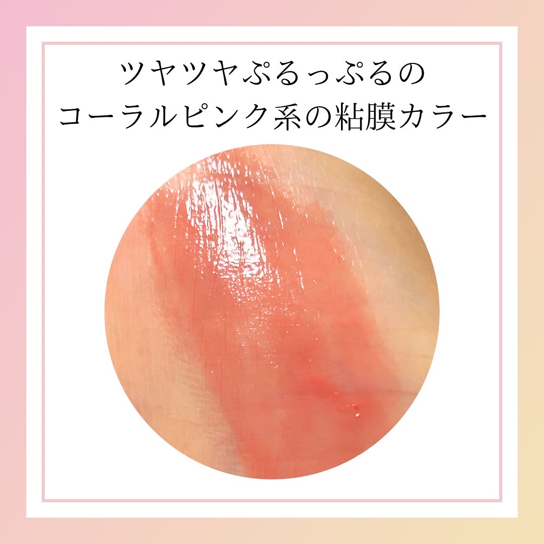 むちっとしたコーラルピンク! ほわっとした発色で白みも感じました✨ シアー感は少なめなので、唇のシワも目立ちにくいと思いました! むちふわ系のピンクリップ好きな人には02番のピンクムーンの雫おすすめです😊