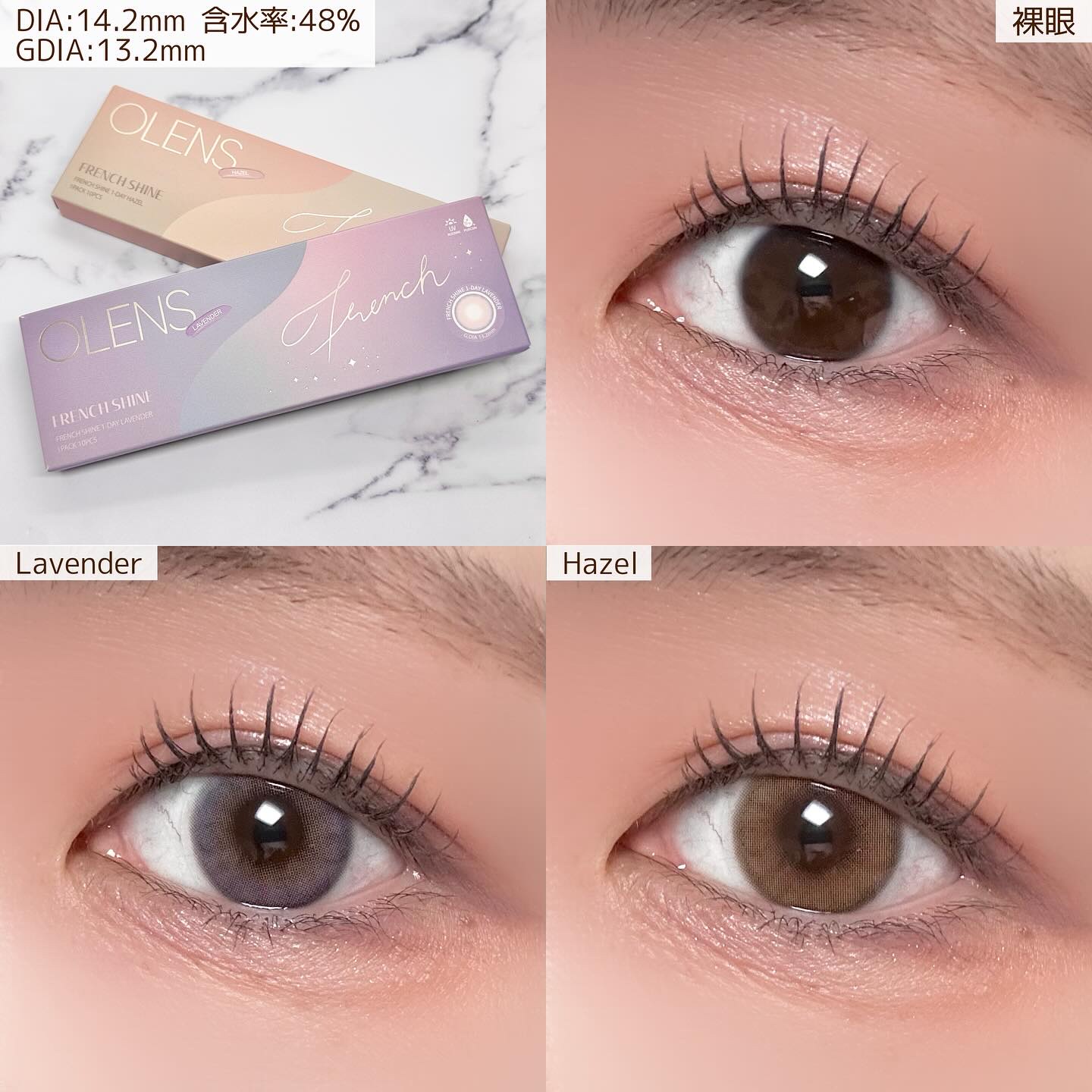 - ■OLENS French Shine(オーレンズフレンチシャイン) 韓国カラコン業界の話題のブランド『OLENS(オーレンズ)』の日本正式承認商品シリーズ。世界中から注目を浴びるグループ「NewJeans (ニュージーンズ)」がイメージモデル。そんなOLENSの新シリーズで、華やかに輝きロマンチックな瞳を演出する『FRENCH SHINE(フレンチシャイン)』が、モアコンタクトに新登場! ナチュラルでほのかに甘いゴールドベースのパステルカラーが瞳にほんのり溶け込むように馴染み、やわらかな輝きを生み出します。 着色直径は13.2mmと裸眼に馴染みやすい4色展開で、煌びやかながらもどこかノスタルジックであたたかな瞳を演出します。 ■使い方 コンタクトレンズは高度管理医療機器です。必ず眼科医の処方に従って購入してください。 ■使用上の留意事項 コンタクトレンズは高度管理医療機器です。眼科医の指導に従い装用期間を厳守し、正しくお使いください。眼の定期検査を必ず受けてください。添付文書を必ず読み、取扱方法、装用時間を守って正しくお使いください。少しでも異常を感じたら、直ちに眼科医の検査を受けてください。
