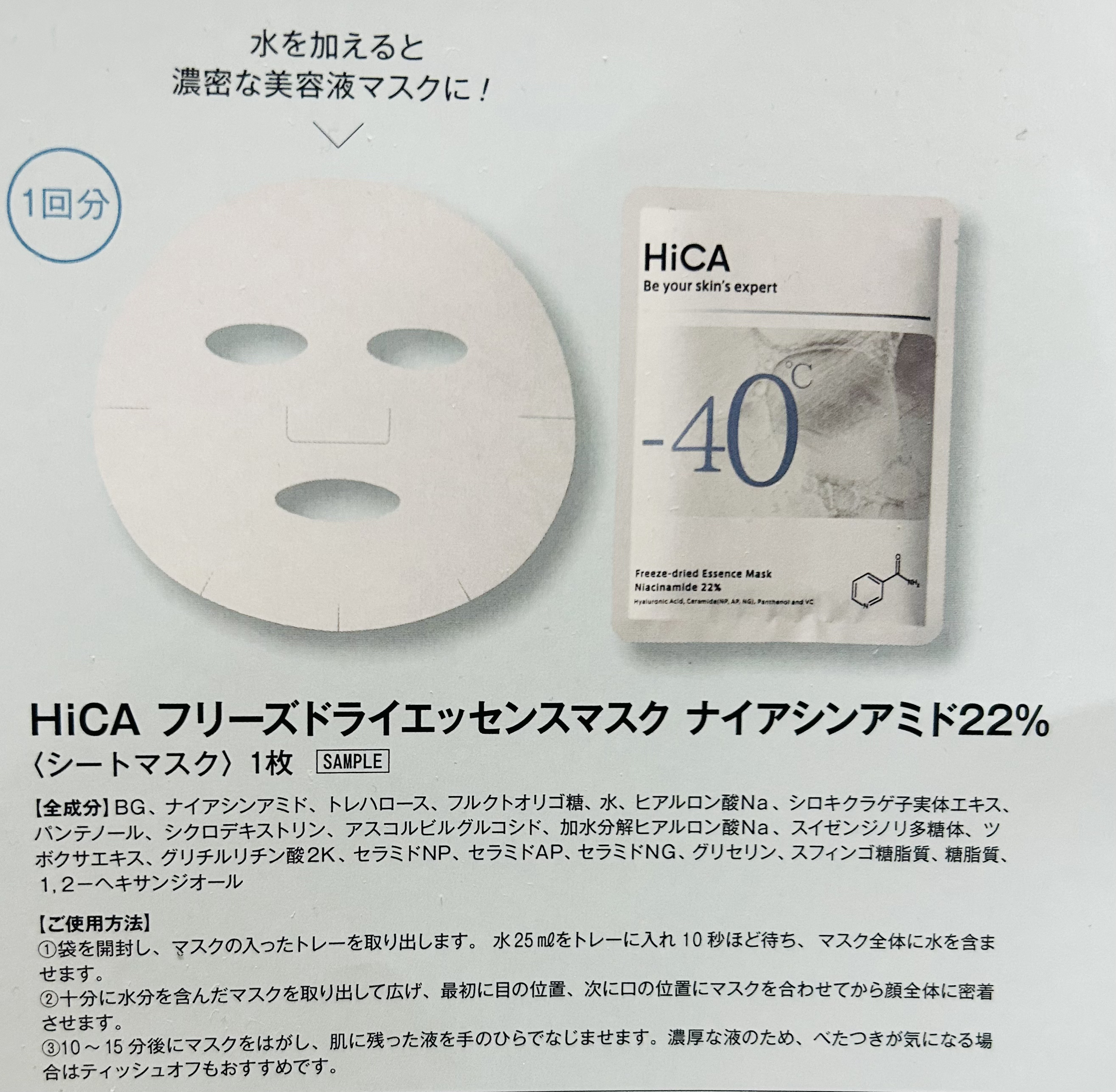 自分でパックに水を含ませてから使用する面白いパックです。 違うシリーズもあるのでぜひ試してみてください🙆♂️ HiCA フリーズドライエッセンスマスク ナイアシンアミド22% フリーズドライされたパックのレビューです。