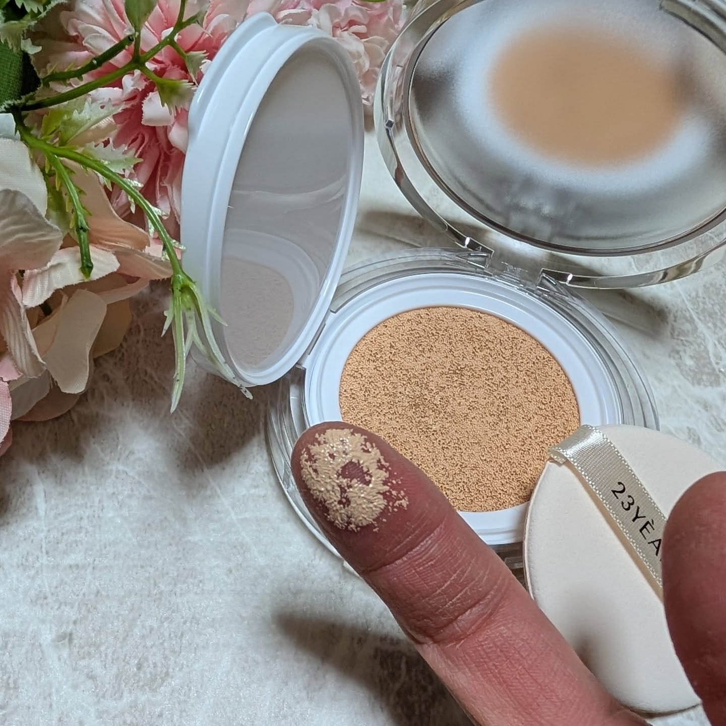クッション部分はしっかりとファンデーションが染み込んでいて、触るとジュワッとするような感覚です。 ツヤ感のある綺麗な仕上がりで、カバー力もあるように思いますが厚塗り感がないのが嬉しいなと思います✨ 薄付きに仕上げられるのですが重ねても重たくならず、仕上がりがとにかく綺麗で肌への密着も良いように感じました。 付けていて肌への圧迫感も感じませんでしたし、使い心地も良くとても気に入りました😊