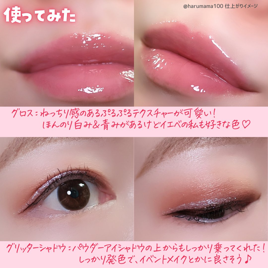 透け感のあるピンクリップで可愛いです!(*´`) グリッターシャドウがついてくるの嬉しいですね✨