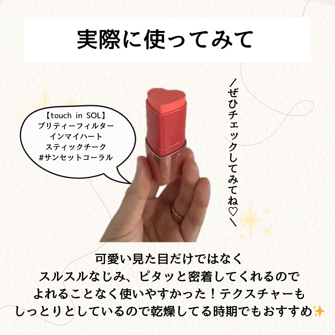 プリティーフィルターインマイハートスティックチーク(#サンセットコーラル)ハートの形が可愛いチーク♡クリーミーなテクスチャーが柔らかく広がって軽くぴったり密着♪毛穴の詰まりと落ちなしで、しっとりしてヨレなしのつやがあるレイヤリング。24時間カ...