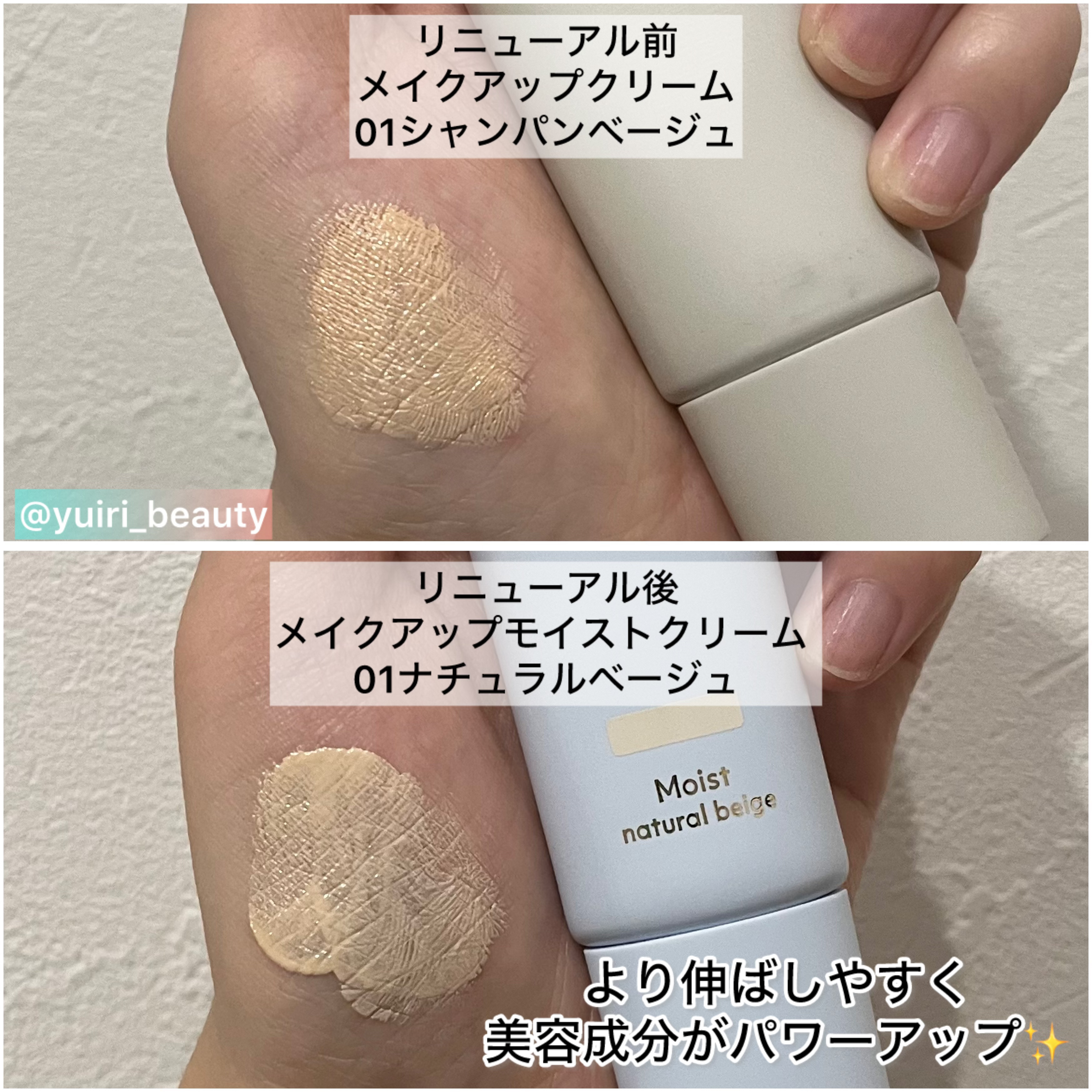密着力が高くなり、ツヤもさらにup🩶 01のナチュラルベージュをお試しさせていただいたのですが明るめカラーで肌馴染みもよくてよかったです! 公式が推奨しているつけ方は、手のひらにのせてのばしてから最初に頬メインにのせていき、指に広がったクリームを細かい部分にトントンと馴染ませるそうです! メイクアップクリームをつけるだけで肌にも優しく、日焼け止め効果もあって快適に過ごせるんですよね◎