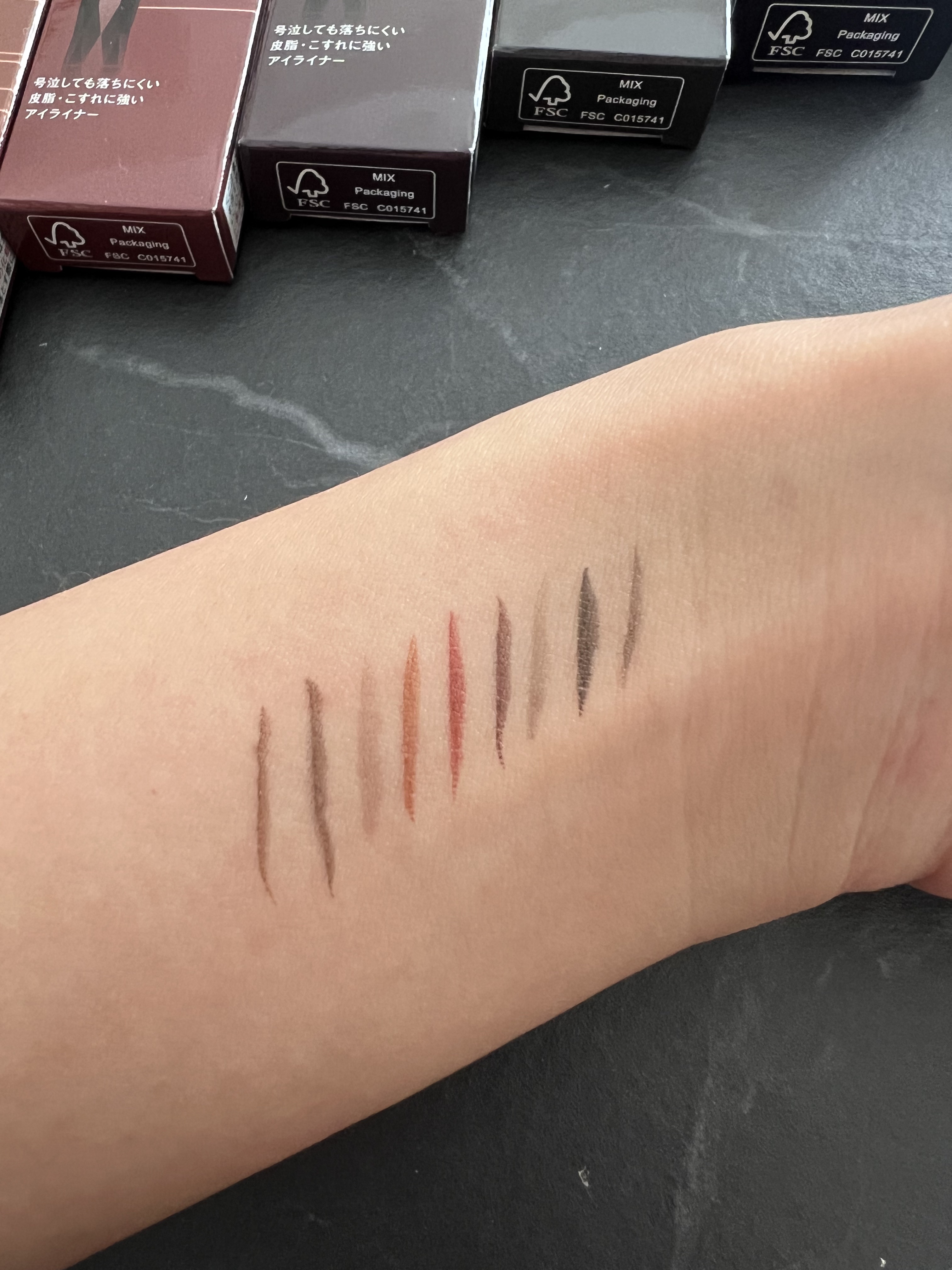- <BK-1 漆黒ブラック> 水、BG、アクリレーツコポリマー、(アクリレーツ/アクリル酸エチルヘキシル)コポリマー、(スチレン/アクリレーツ)コポリマー、アクリレーツコポリマーアンモニウム、PEG-60水添ヒマシ油、DPG、ラウレス-21、AMP、(アクリレーツ/メタクリル酸ステアレス-20)コポリマー、EDTA-2Na、ポリグリセリル-3ジシロキサンジメチコン、クエン酸、ステアリン酸PEG-40、トリイソステアリン酸ポリグリセリル-2、ポリリシノレイン酸ポリグリセリル-6、セスキイソステアリン酸ソルビタン、フェノキシエタノール、メチルパラベン、エチルパラベン、(+/-)カーボンブラック、酸化鉄、赤226、(チタン/酸化チタン)焼結物 <BR-1 自然なブラウン> 水、BG、アクリレーツコポリマー、(アクリレーツ/アクリル酸エチルヘキシル)コポリマー、(スチレン/アクリレーツ)コポリマー、アクリレーツコポリマーアンモニウム、PEG-60水添ヒマシ油、DPG、ラウレス-21、AMP、(アクリレーツ/メタクリル酸ステアレス-20)コポリマー、EDTA-2Na、ポリグリセリル-3ジシロキサンジメチコン、クエン酸、ステアリン酸PEG-40、トリイソステアリン酸ポリグリセリル-2、ポリリシノレイン酸ポリグリセリル-6、セスキイソステアリン酸ソルビタン、フェノキシエタノール、メチルパラベン、エチルパラベン、(+/-)カーボンブラック、酸化鉄、赤226、(チタン/酸化チタン)焼結物 <BR-2 ビターブラウン> 水、BG、アクリレーツコポリマー、(アクリレーツ/アクリル酸エチルヘキシル)コポリマー、(スチレン/アクリレーツ)コポリマー、アクリレーツコポリマーアンモニウム、PEG-60水添ヒマシ油、DPG、ラウレス-21、AMP、(アクリレーツ/メタクリル酸ステアレス-20)コポリマー、EDTA-2Na、ポリグリセリル-3ジシロキサンジメチコン、クエン酸、ステアリン酸PEG-40、トリイソステアリン酸ポリグリセリル-2、ポリリシノレイン酸ポリグリセリル-6、セスキイソステアリン酸ソルビタン、フェノキシエタノール、メチルパラベン、エチルパラベン、(+/-)カーボンブラック、酸化鉄、赤226、(チタン/酸化チタン)焼結物 <BR-3 ウォームブラウン> 水、BG、アクリレーツコポリマー、(アクリレーツ/アクリル酸エチルヘキシル)コポリマー、(スチレン/アクリレーツ)コポリマー、アクリレーツコポリマーアンモニウム、PEG-60水添ヒマシ油、DPG、ラウレス-21、AMP、(アクリレーツ/メタクリル酸ステアレス-20)コポリマー、EDTA-2Na、ポリグリセリル-3ジシロキサンジメチコン、クエン酸、ステアリン酸PEG-40、トリイソステアリン酸ポリグリセリル-2、ポリリシノレイン酸ポリグリセリル-6、セスキイソステアリン酸ソルビタン、フェノキシエタノール、メチルパラベン、エチルパラベン、(+/-)カーボンブラック、酸化鉄、赤226、(チタン/酸化チタン)焼結物 <GY-1 ダークグレージュ> 水、BG、アクリレーツコポリマー、(アクリレーツ/アクリル酸エチルヘキシル)コポリマー、(スチレン/アクリレーツ)コポリマー、アクリレーツコポリマーアンモニウム、PEG-60水添ヒマシ油、DPG、ラウレス-21、AMP、(アクリレーツ/メタクリル酸ステアレス-20)コポリマー、EDTA-2Na、ポリグリセリル-3ジシロキサンジメチコン、クエン酸、ステアリン酸PEG-40、トリイソステアリン酸ポリグリセリル-2、ポリリシノレイン酸ポリグリセリル-6、セスキイソステアリン酸ソルビタン、フェノキシエタノール、メチルパラベン、エチルパラベン、(+/-)カーボンブラック、酸化鉄、赤226、(チタン/酸化チタン)焼結物 <BK-1 漆黒ブラック(レフィル)> 水、BG、アクリレーツコポリマー、(アクリレーツ/アクリル酸エチルヘキシル)コポリマー、(スチレン/アクリレーツ)コポリマー、アクリレーツコポリマーアンモニウム、PEG-60水添ヒマシ油、DPG、ラウレス-21、AMP、(アクリレーツ/メタクリル酸ステアレス-20)コポリマー、EDTA-2Na、ポリグリセリル-3ジシロキサンジメチコン、クエン酸、ステアリン酸PEG-40、トリイソステアリン酸ポリグリセリル-2、ポリリシノレイン酸ポリグリセリル-6、セスキイソステアリン酸ソルビタン、フェノキシエタノール、メチルパラベン、エチルパラベン、(+/-)カーボンブラック、酸化鉄、赤226、(チタン/酸化チタン)焼結物 <BR-1 自然なブラウン(レフィル)> 水、BG、アクリレーツコポリマー、(アクリレーツ/アクリル酸エチルヘキシル)コポリマー、(スチレン/アクリレーツ)コポリマー、アクリレーツコポリマーアンモニウム、PEG-60水添ヒマシ油、DPG、ラウレス-21、AMP、(アクリレーツ/メタクリル酸ステアレス-20)コポリマー、EDTA-2Na、ポリグリセリル-3ジシロキサンジメチコン、クエン酸、ステアリン酸PEG-40、トリイソステアリン酸ポリグリセリル-2、ポリリシノレイン酸ポリグリセリル-6、セスキイソステアリン酸ソルビタン、フェノキシエタノール、メチルパラベン、エチルパラベン、(+/-)カーボンブラック、酸化鉄、赤226、(チタン/酸化チタン)焼結物 <BR-2 ビターブラウン(レフィル)> 水、BG、アクリレーツコポリマー、(アクリレーツ/アクリル酸エチルヘキシル)コポ
