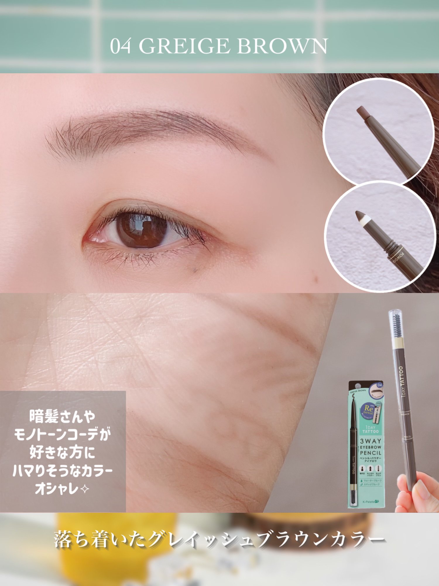 - <Point> なめらかペンシル ・さらに落ちにくく耐久性UP。 ・ムラなく均一にふんわり好発色。 ・楕円芯で太細ラインも自由自在のなめらかな描き心地。 なじませパウダー ・オイル質感でほんのりくすみ感のあるパウダーが均一に色づき、ふんわりやわらかい発色に。 ・艶パール新配合でほんのり艶めく立体的な眉に。 仕上げブラシ 描いたラインやパウダーをぼかしたり、毛流れに沿って整えられる万能ブラシ。 <01 ミルクティブラウン> 軽やかな明るい黄み系ブラウン ~イエロー系~ベージュ系の明るい髪色に~ <02 ナチュラルブラウン> 抜け感のある自然なブラウン ~自然な明るさのブラウン系の髪色に~ <03 ココアブラウン> あたたかみを感じる赤み系ブラウン ~赤み・ピンクみのある暖色系の髪色に~ <04 グレージュブラウン> 肌なじみの良いグレー系ブラウン ~黒髪~アッシュ系の髪色に~ ※2025年1月20日よりK-パレット 公式オンラインショップ販売開始 ※2025年1月21日より一部企業先行発売