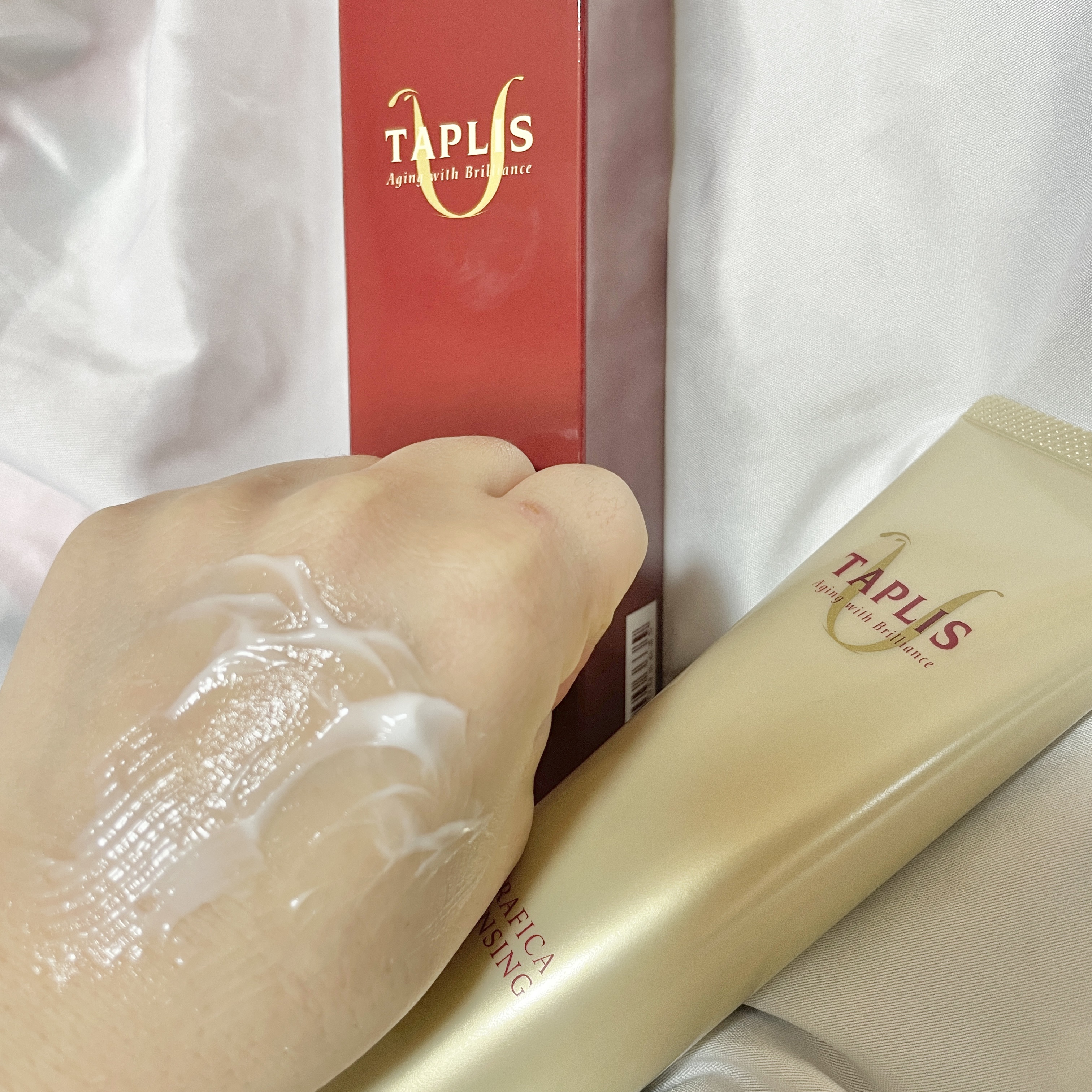 TAPLIS(タプリス)シリーズは、女性美を引き出す植物性成分「プエラリア・ミリフィカ」を始めとする、豊富な美容成分を配合した本格派エイジングケアシリーズです。 なめらかなクリームで肌あたり優しく、くるくると優しく撫でるだけで汚れが浮いてきて、潤いはしっかり残しながらメイク汚れをスルスルと落としていきます。 流した後はしっとり、べたつきもなく気持ちのいい仕上がりに大満足でした🩷