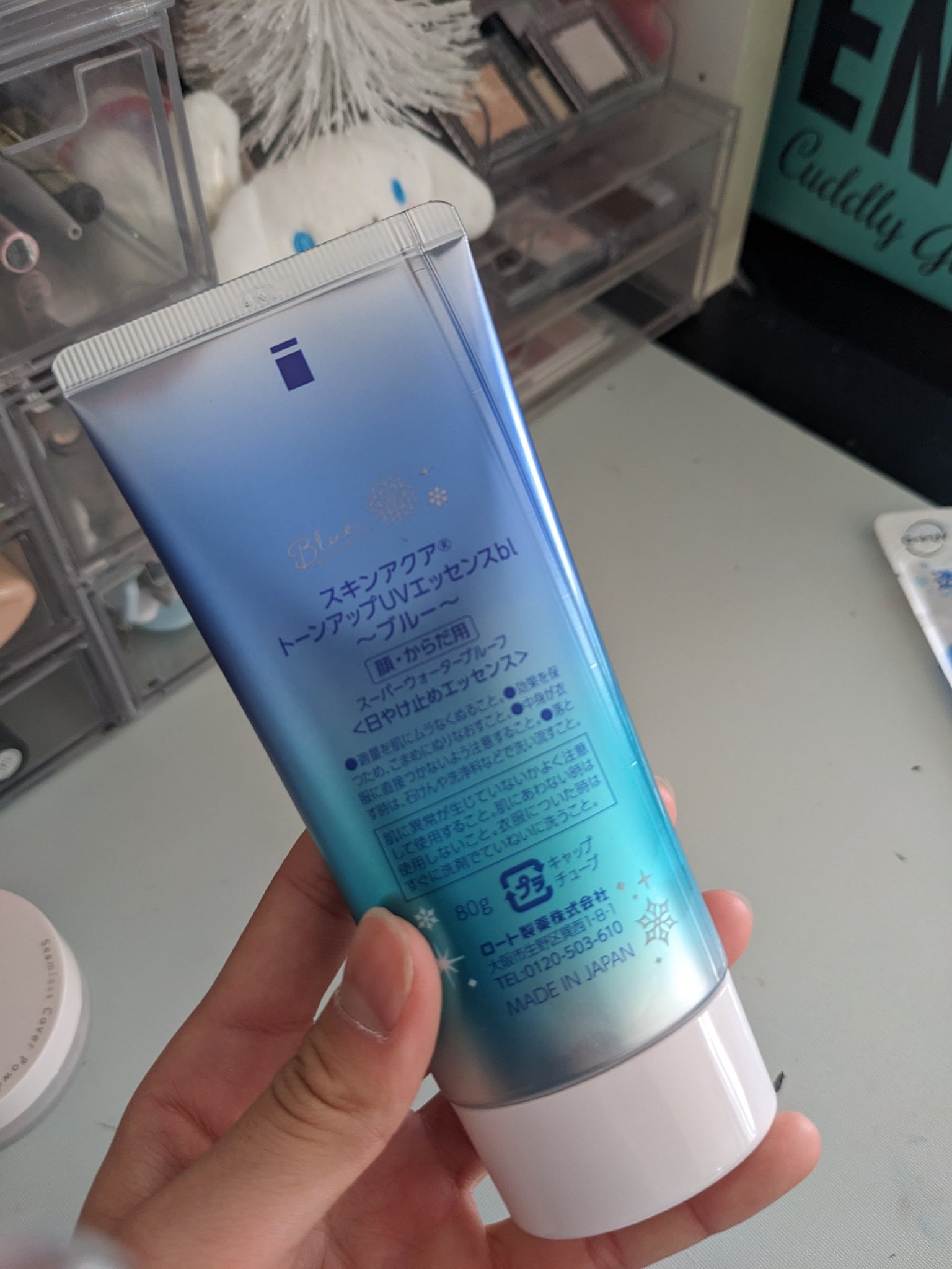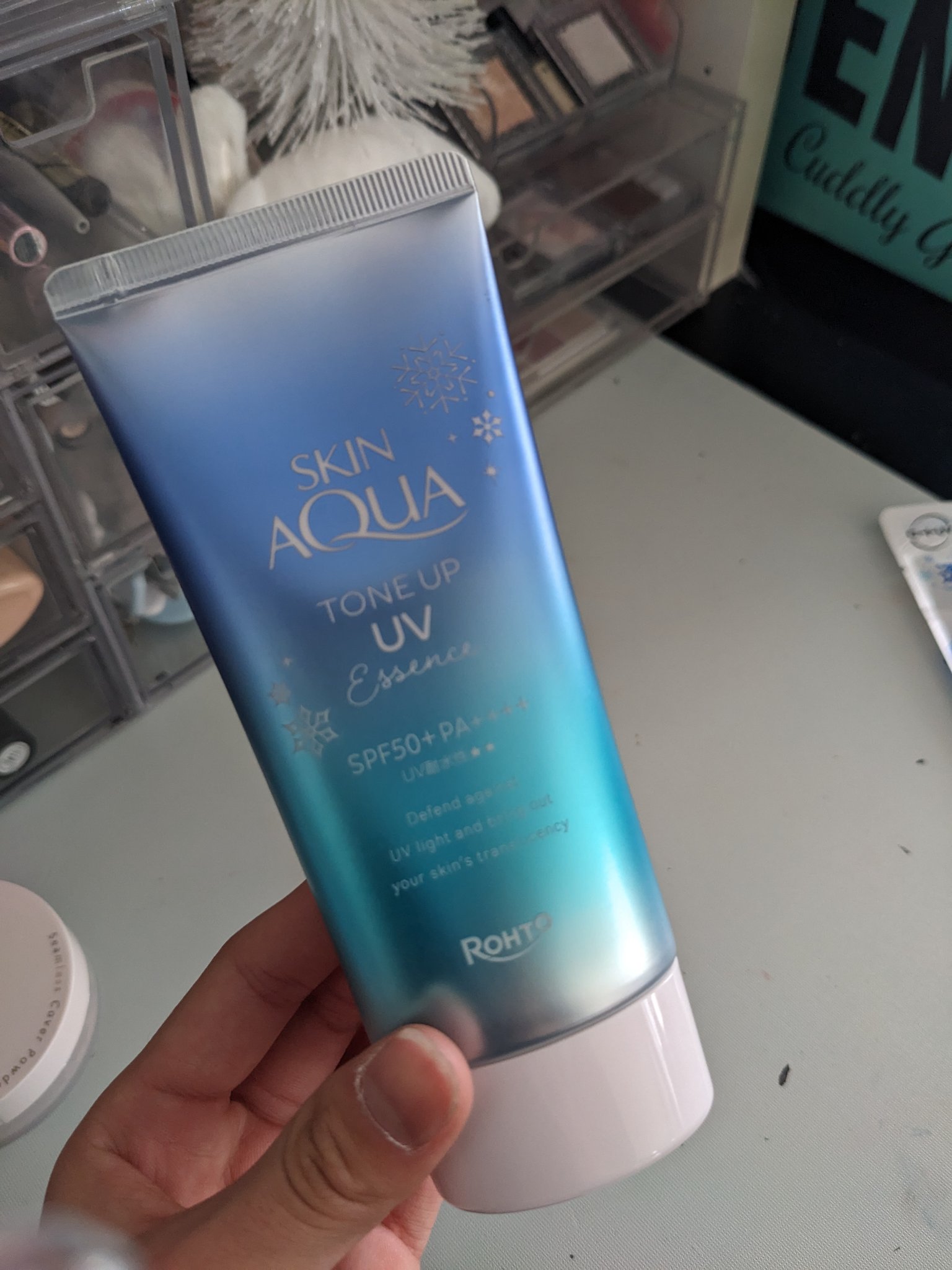 うるおい成分配合のスキンアクアトーンアップUVエッセンスシリーズから新登場したはかなげブルー💙 血色感を抑えてはかなげな色白肌*へ❄ テクスチャーは透明感あるブルー色でスキンケアのような軽い塗り心地&仕上がりが良かった✨ 顔と首の境目が気になっていたから出会えて嬉しいアイテム💓🫶