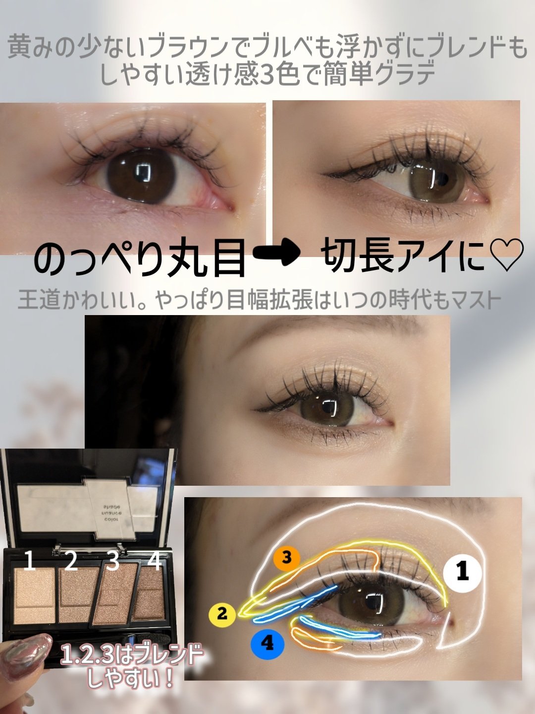 - カラーニュアンスシェードを目尻に入れるだけで目幅を大きく見せ※、抜け感のある明るい大きな目元に仕上るブラウンアイシャドウ。 ブラウン×カラーニュアンスの4色セット。※メイクアップ効果