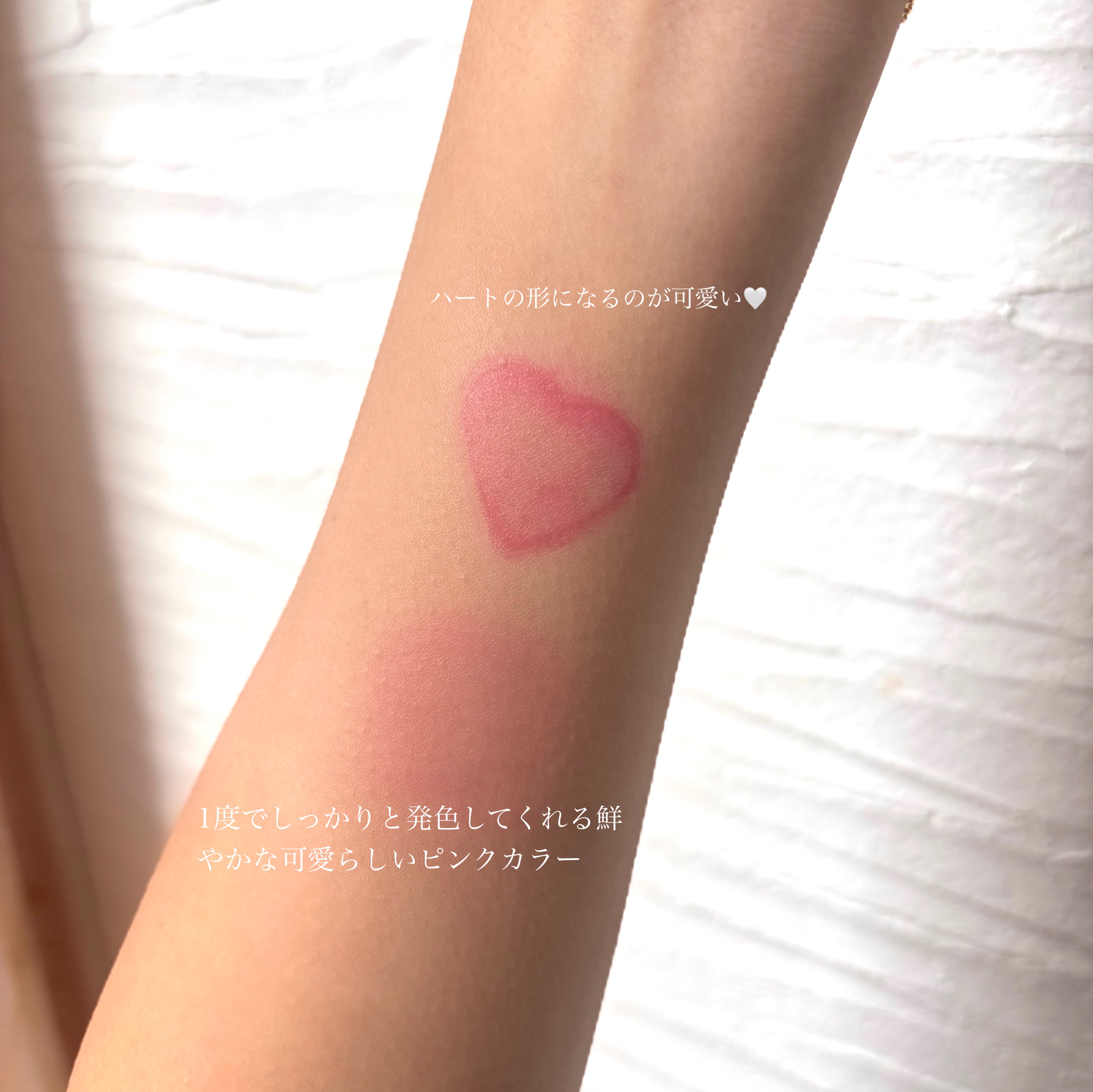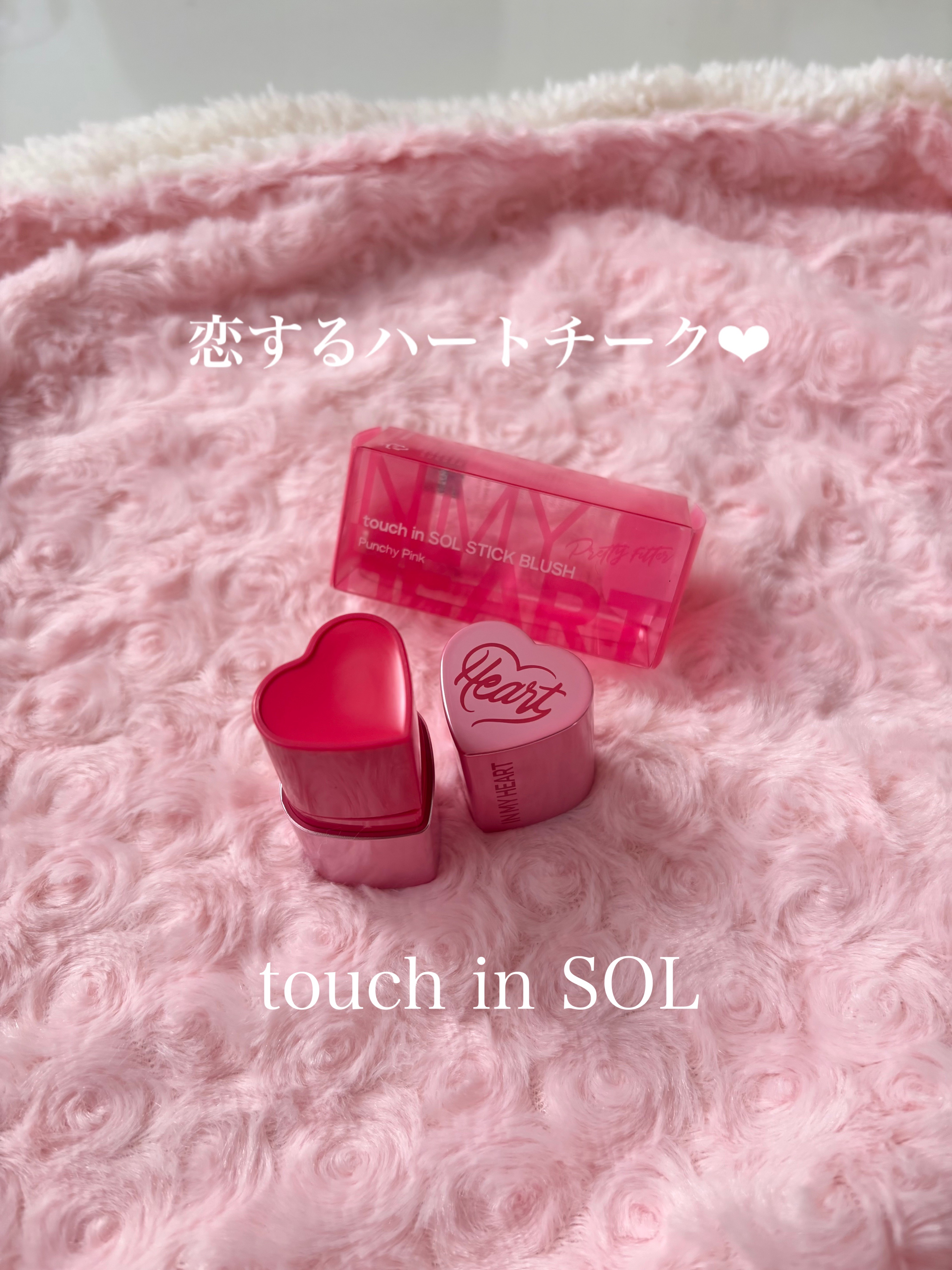 見た目も可愛く、美しい発色も続く touch in SOLのなめらかクリーミーなハート型チーク💕 馴染ませるとほわっとした発色で自然に馴染んでとっても可愛い❤️ 発色はなんと24時間持続するそうです✨️