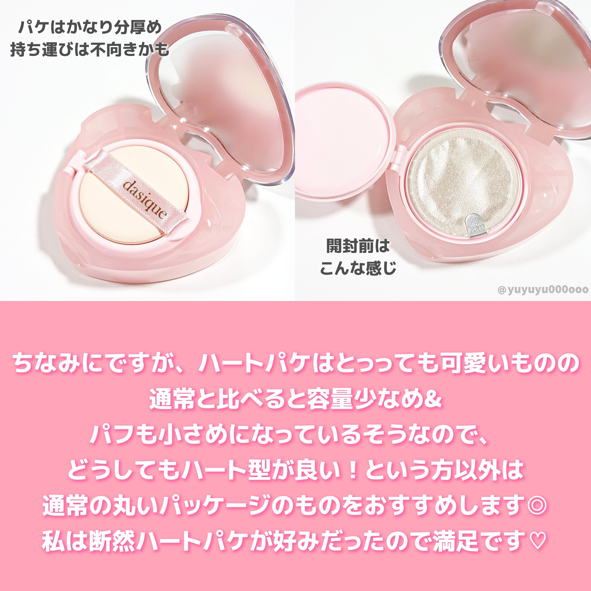 ぷっくりハートが可愛いdasique新作クッションファンデ💗 このハートの形のクッション楽しみにしてたんです✨ 通常パケは丸型でハート型は限定です。 テクスチャーは軽めなのですがモチッとした仕上がりで乾燥崩れしにくいと感じました!べたつきにくいところも良し。 Qoo10公式では2024年7月17日から発売されています!ハート型のパケは限定なので気になる方はお早めにチェックしてみてくださいね🫶💓