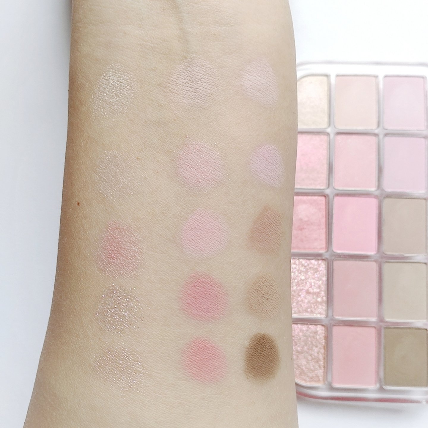 プチプラのクオリティじゃないっ!! 発売前からチェックしていたけれど、ここまで可愛いとは…😆 絶妙カラーで目もとのくすみを飛ばして*明るい印象に🩷 横割りグラデーションでメイクし、立体感をより出したかったので最後に1番左のカラーを上まぶたの真ん中と涙袋にのせています🙆 肌馴染みも良くて粉飛びも感じにくかったです💕 ブラウンの方も店頭に出てたら買おうかな💓