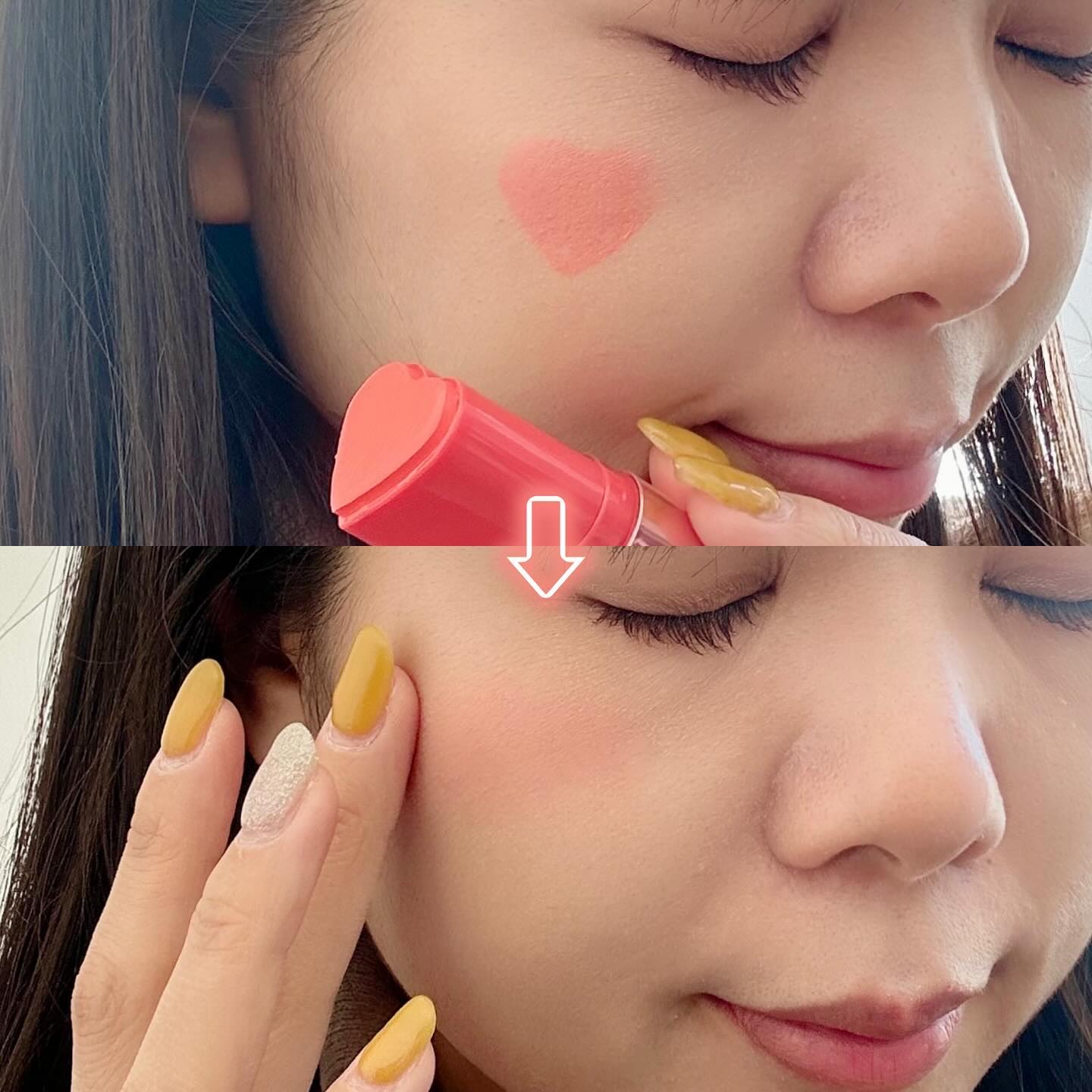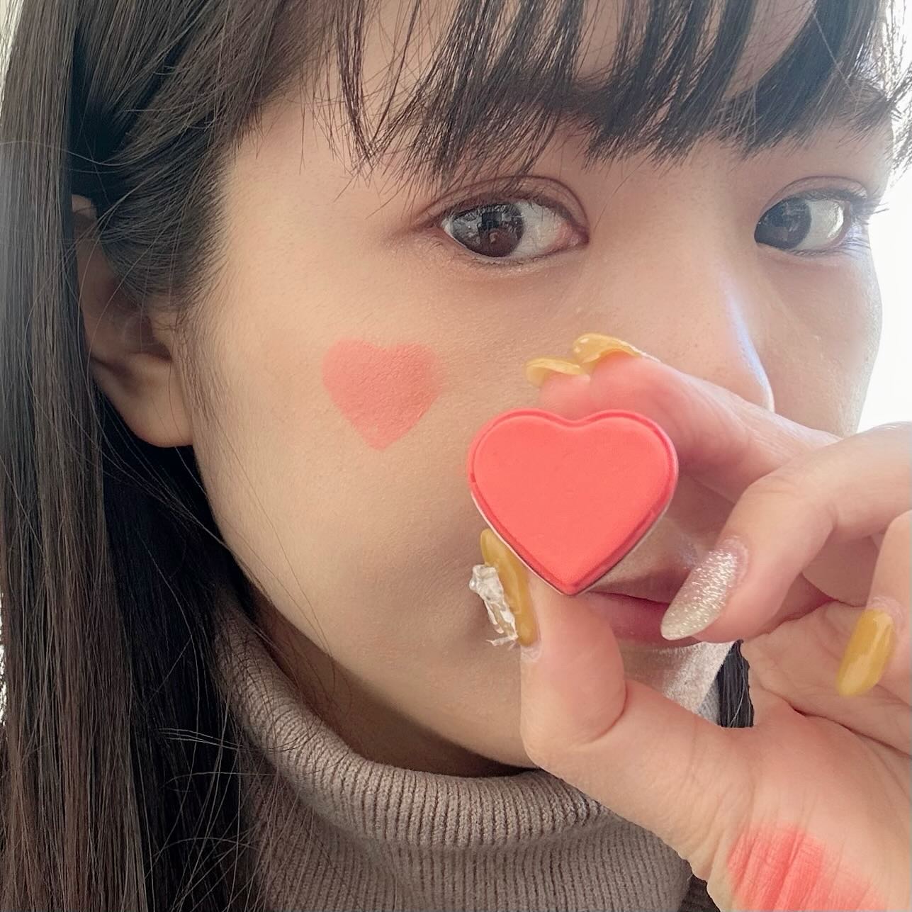 タッチインソルのハート型スティックチークがヤバい!綺麗に発色してくれて光を取り込むようなツヤ質感が可愛すぎ! とにかくパケが可愛すぎて大優勝🧚♂️✨そして落ちにくくてカラーの持続力もある! 私はサンセットコーラルがお気に入り!軽くポンポンつけてナチュラル発色にする使い方がオススメだよ🥹🤍