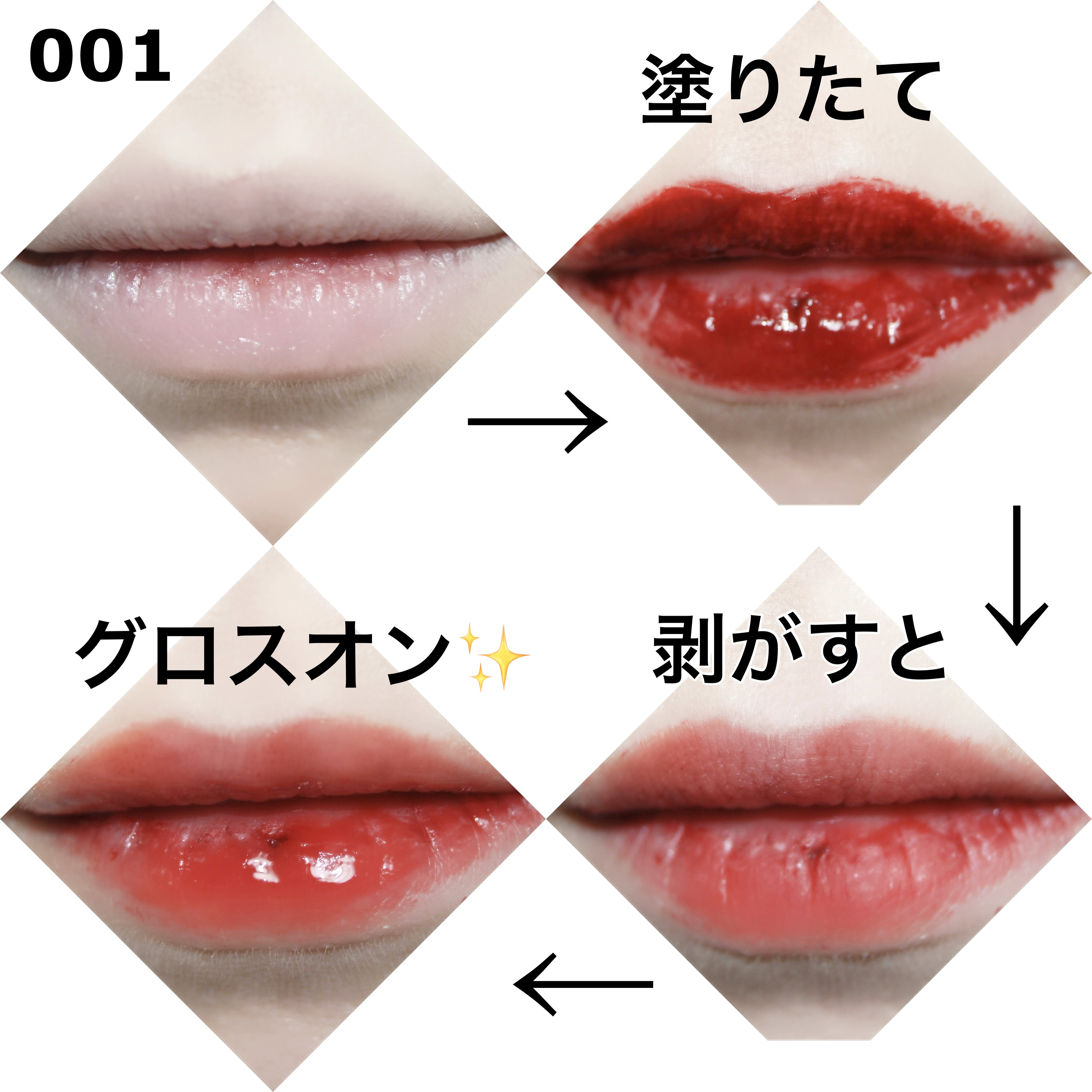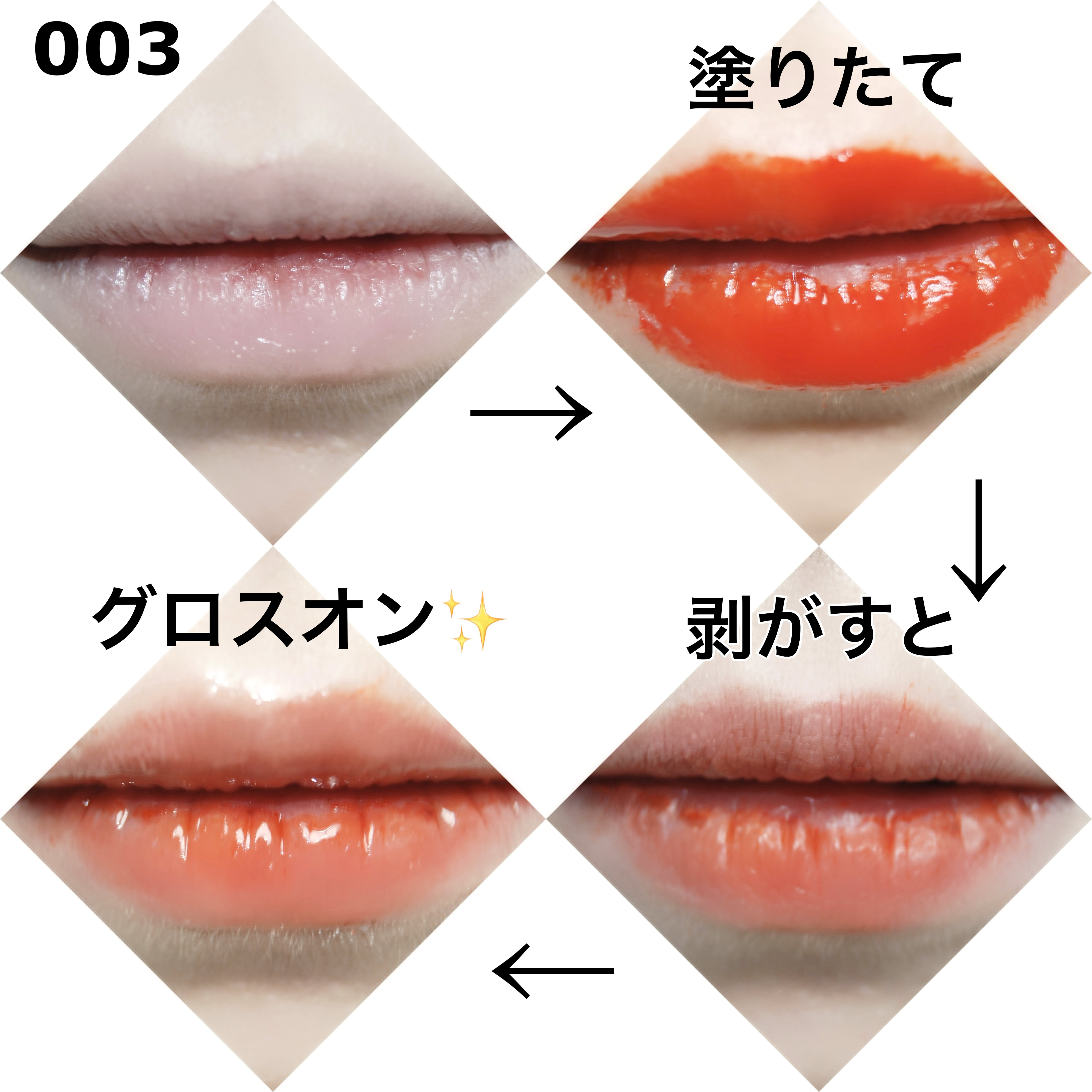 実際に塗ってみるとツヤツヤで じゅわっと広がるような 透け感のある発色がとっても 可愛かったです🍬 保湿感は感じられますが ベタつきにくいので不快な感覚もないです。 色も結構しっかり残ります。 1日経ってもうっすら色が残っているのが 分かりました。 個人的に1番気に入ったのは03の デューイーフィグです🌼 唇にのせた瞬間 お顔に血色と透明感が出たので これから出番が多そうです。 あとは、04の チリングレッドも 気に入っています🍎 パッキリとした赤なので浮くかなと 思ったんですがツヤと透明感があるので 重くなりすぎずこれからの夏メイクに 使いたいです🌻 また、塗り重ねる事で濃淡が変わるので 自分だけの好きな発色を調整できて 嬉しいですね💕
