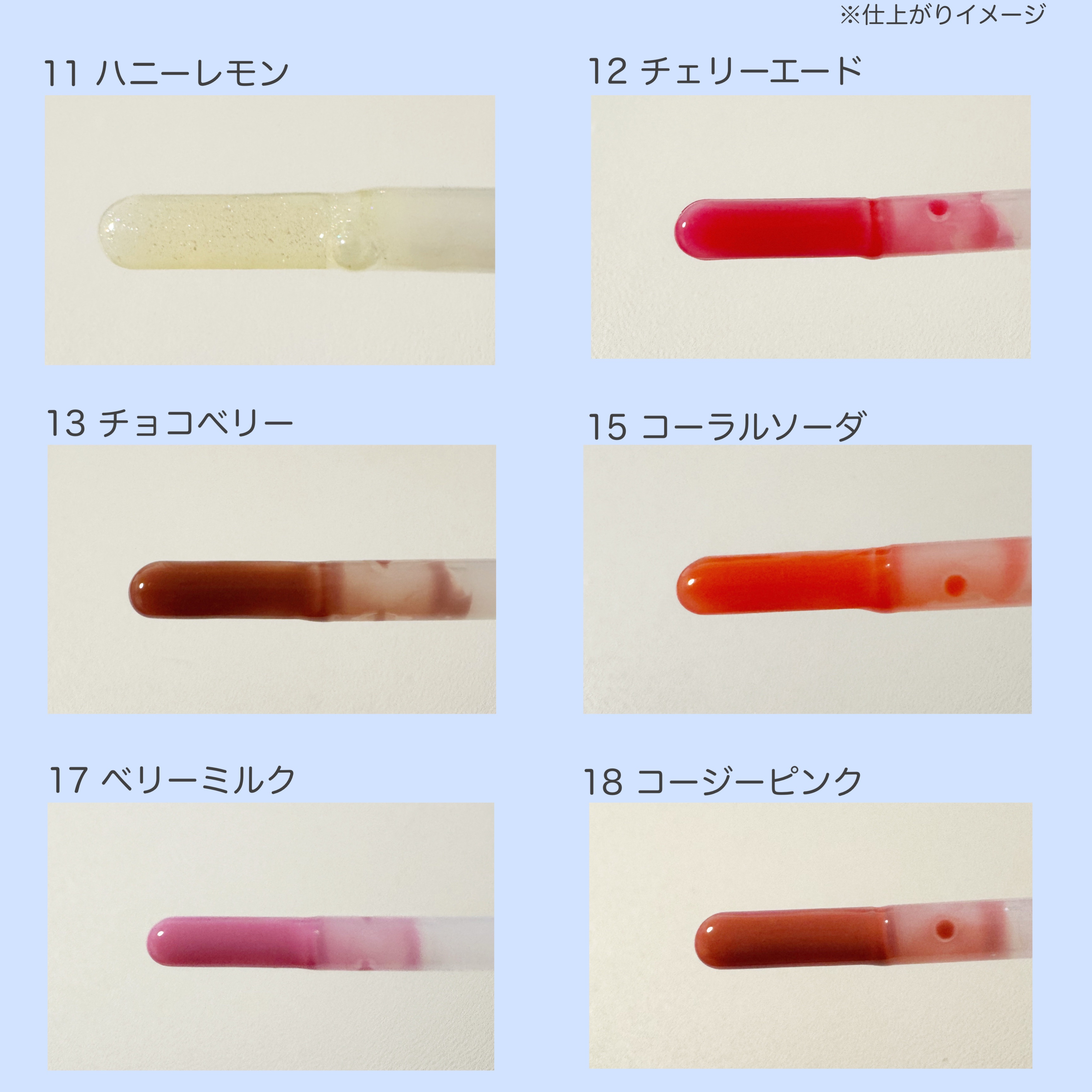 唇の角質改善、唇のしわをカバーしてくれるボリューム感リップオイル!特に11番は、塗った直後に唇にパックをしたように弾力が出て、プランピング効果も2倍!! マットなリップスティック、ティントをまずベースに塗って、その上にトコボ リップオイルを塗ると魅力的な「タンフル(粘膜)リップ」の完成! 11ハニーレモン(プランパー効果2倍!) 12チェリーエード 13チョコベリー 14ピーチネクター 日本限定色 15コーラルソーダ 16アップルマンゴー 日本限定色 17 ベリーミルク 18コージーピンク