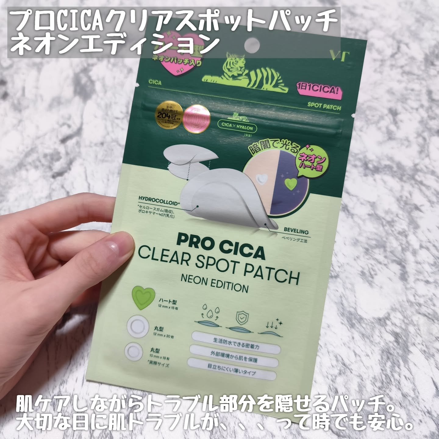 肌揺らぎの時こそ楽しも✊ 💚VT プロCICAクリアスポットパッチネオンエディション 💚 大事なイベントや楽しみにしてたお出かけ前に限ってニキビなどできちゃう時ない?😭 パッチのハート型…暗闇で光っちゃいます🥺 だからトラブルをさりげなくカバーしながら会場でも楽しく過ごせちゃうかも🥺❤️ もちろん光るハート型じゃなくて光らない丸型も一緒に入ってるよ🙆♀️ツボクサから抽出された成分が配合されてるの🙆♀️