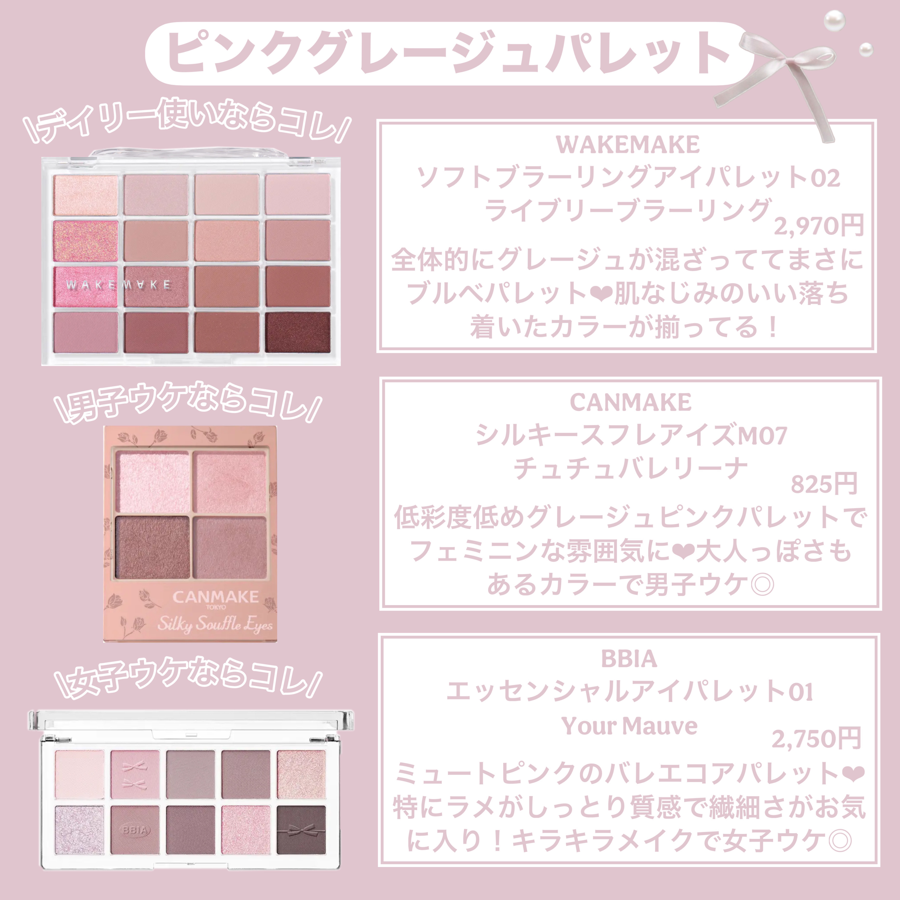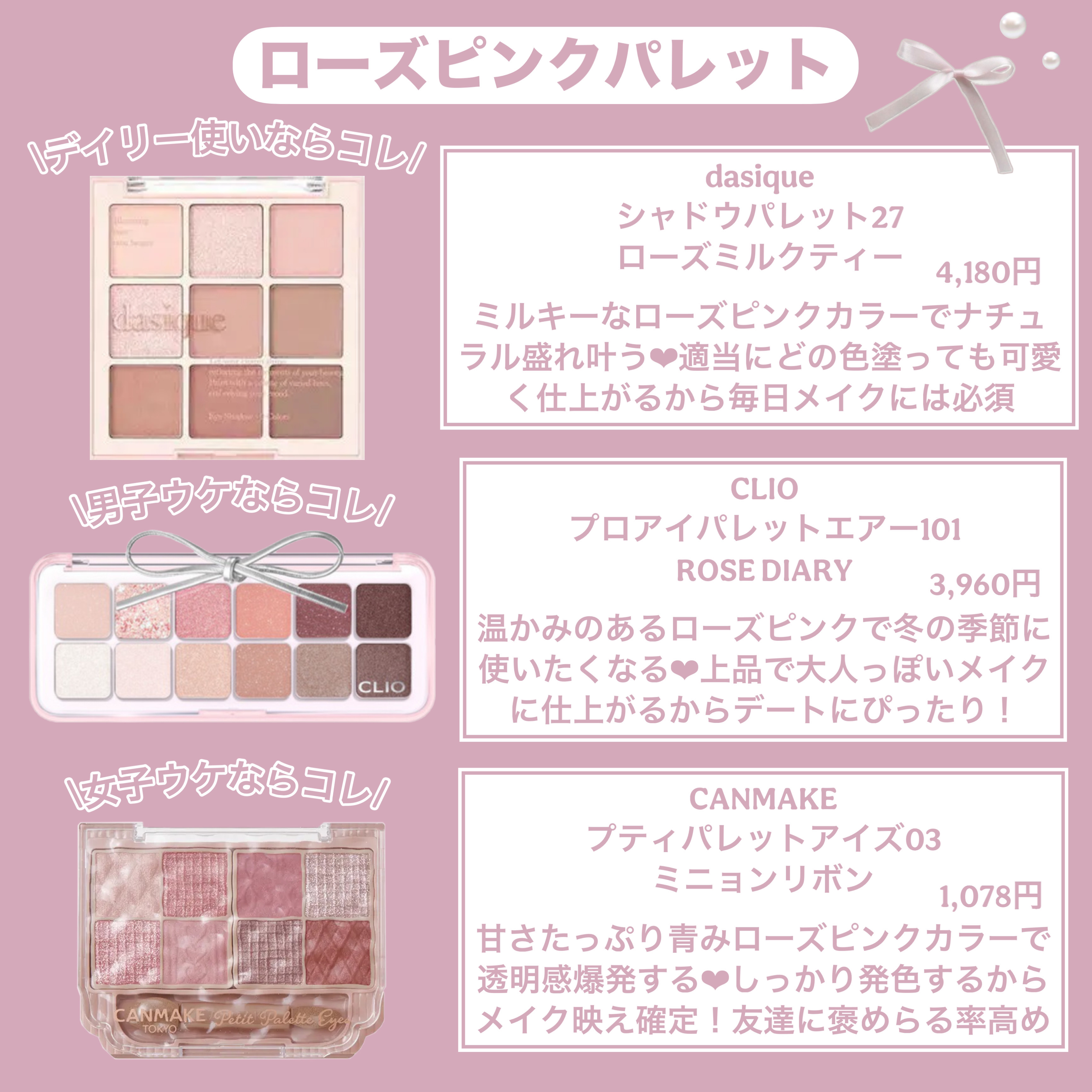 2ndイエベさんにおすすめ Laka フォーエバー6アイパレット 03 プリムローズ ¥2,376 しっとりした粉質が好きな人におすすめ CLIO プロ アイ パレット エアー #04 ピンクペアリング ¥2,312 淡いメイクが好きな人におすすめ rom&nd ベターザンパレット 06 ピオニーヌードガーデン ¥2,320