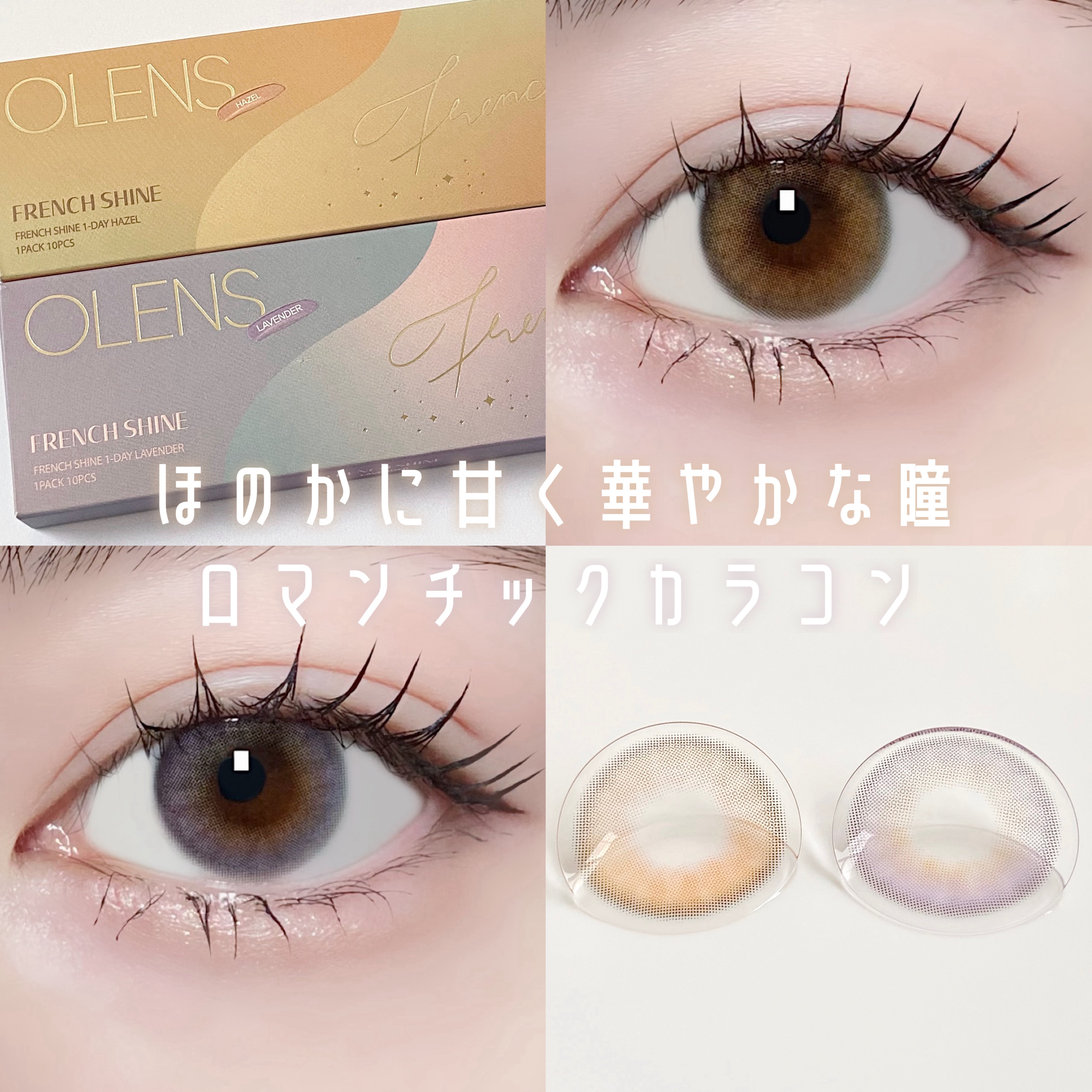 - ■OLENS French Shine(オーレンズフレンチシャイン) 韓国カラコン業界の話題のブランド『OLENS(オーレンズ)』の日本正式承認商品シリーズ。世界中から注目を浴びるグループ「NewJeans (ニュージーンズ)」がイメージモデル。そんなOLENSの新シリーズで、華やかに輝きロマンチックな瞳を演出する『FRENCH SHINE(フレンチシャイン)』が、モアコンタクトに新登場! ナチュラルでほのかに甘いゴールドベースのパステルカラーが瞳にほんのり溶け込むように馴染み、やわらかな輝きを生み出します。 着色直径は13.2mmと裸眼に馴染みやすい4色展開で、煌びやかながらもどこかノスタルジックであたたかな瞳を演出します。 ■使い方 コンタクトレンズは高度管理医療機器です。必ず眼科医の処方に従って購入してください。 ■使用上の留意事項 コンタクトレンズは高度管理医療機器です。眼科医の指導に従い装用期間を厳守し、正しくお使いください。眼の定期検査を必ず受けてください。添付文書を必ず読み、取扱方法、装用時間を守って正しくお使いください。少しでも異常を感じたら、直ちに眼科医の検査を受けてください。