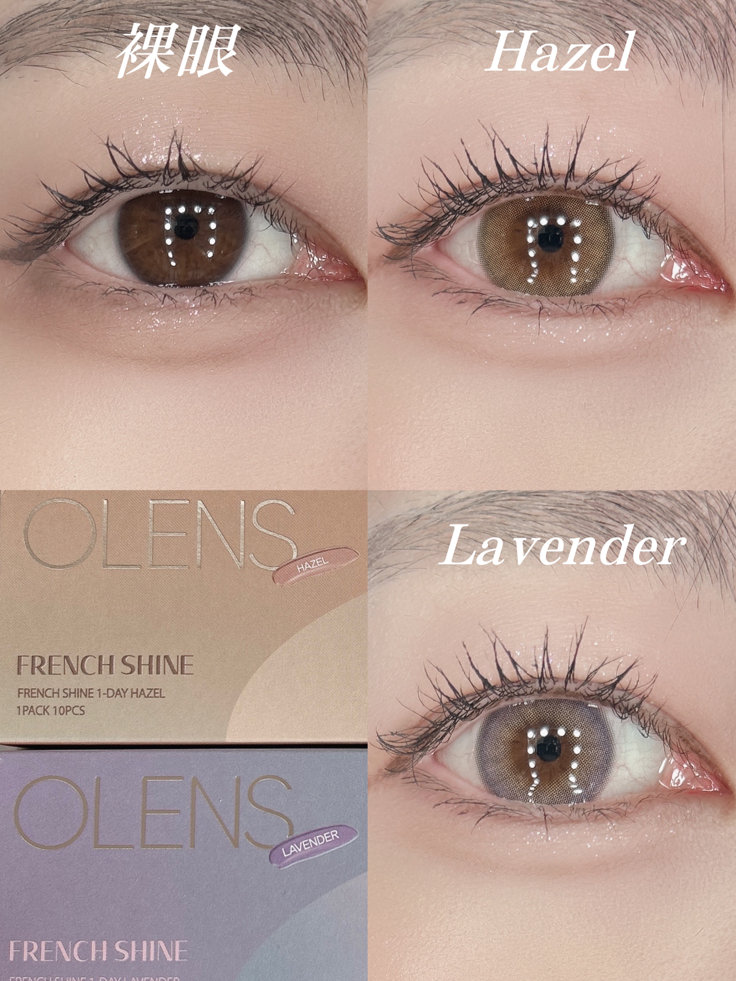 - ■OLENS French Shine(オーレンズフレンチシャイン) 韓国カラコン業界の話題のブランド『OLENS(オーレンズ)』の日本正式承認商品シリーズ。世界中から注目を浴びるグループ「NewJeans (ニュージーンズ)」がイメージモデル。そんなOLENSの新シリーズで、華やかに輝きロマンチックな瞳を演出する『FRENCH SHINE(フレンチシャイン)』が、モアコンタクトに新登場! ナチュラルでほのかに甘いゴールドベースのパステルカラーが瞳にほんのり溶け込むように馴染み、やわらかな輝きを生み出します。 着色直径は13.2mmと裸眼に馴染みやすい4色展開で、煌びやかながらもどこかノスタルジックであたたかな瞳を演出します。 ■使い方 コンタクトレンズは高度管理医療機器です。必ず眼科医の処方に従って購入してください。 ■使用上の留意事項 コンタクトレンズは高度管理医療機器です。眼科医の指導に従い装用期間を厳守し、正しくお使いください。眼の定期検査を必ず受けてください。添付文書を必ず読み、取扱方法、装用時間を守って正しくお使いください。少しでも異常を感じたら、直ちに眼科医の検査を受けてください。