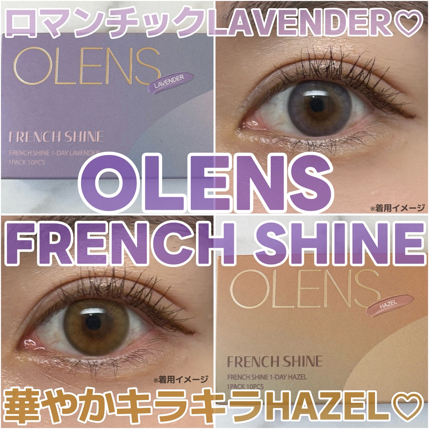 - ■OLENS French Shine(オーレンズフレンチシャイン) 韓国カラコン業界の話題のブランド『OLENS(オーレンズ)』の日本正式承認商品シリーズ。世界中から注目を浴びるグループ「NewJeans (ニュージーンズ)」がイメージモデル。そんなOLENSの新シリーズで、華やかに輝きロマンチックな瞳を演出する『FRENCH SHINE(フレンチシャイン)』が、モアコンタクトに新登場! ナチュラルでほのかに甘いゴールドベースのパステルカラーが瞳にほんのり溶け込むように馴染み、やわらかな輝きを生み出します。 着色直径は13.2mmと裸眼に馴染みやすい4色展開で、煌びやかながらもどこかノスタルジックであたたかな瞳を演出します。 ■使い方 コンタクトレンズは高度管理医療機器です。必ず眼科医の処方に従って購入してください。 ■使用上の留意事項 コンタクトレンズは高度管理医療機器です。眼科医の指導に従い装用期間を厳守し、正しくお使いください。眼の定期検査を必ず受けてください。添付文書を必ず読み、取扱方法、装用時間を守って正しくお使いください。少しでも異常を感じたら、直ちに眼科医の検査を受けてください。