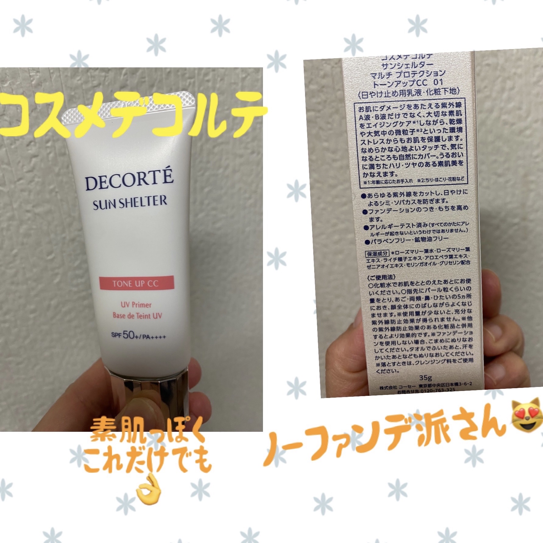【使った商品】DECORTÉサンシェルター マルチプロテクション トーンアップCC ラベンダーローズ【崩れにくさ】比較的崩れにくい【カバー力】割とある【ツヤorマット】ツヤ【良いところ】トーンアップがかなりある【イマイチなところ】ファンデーシ...
