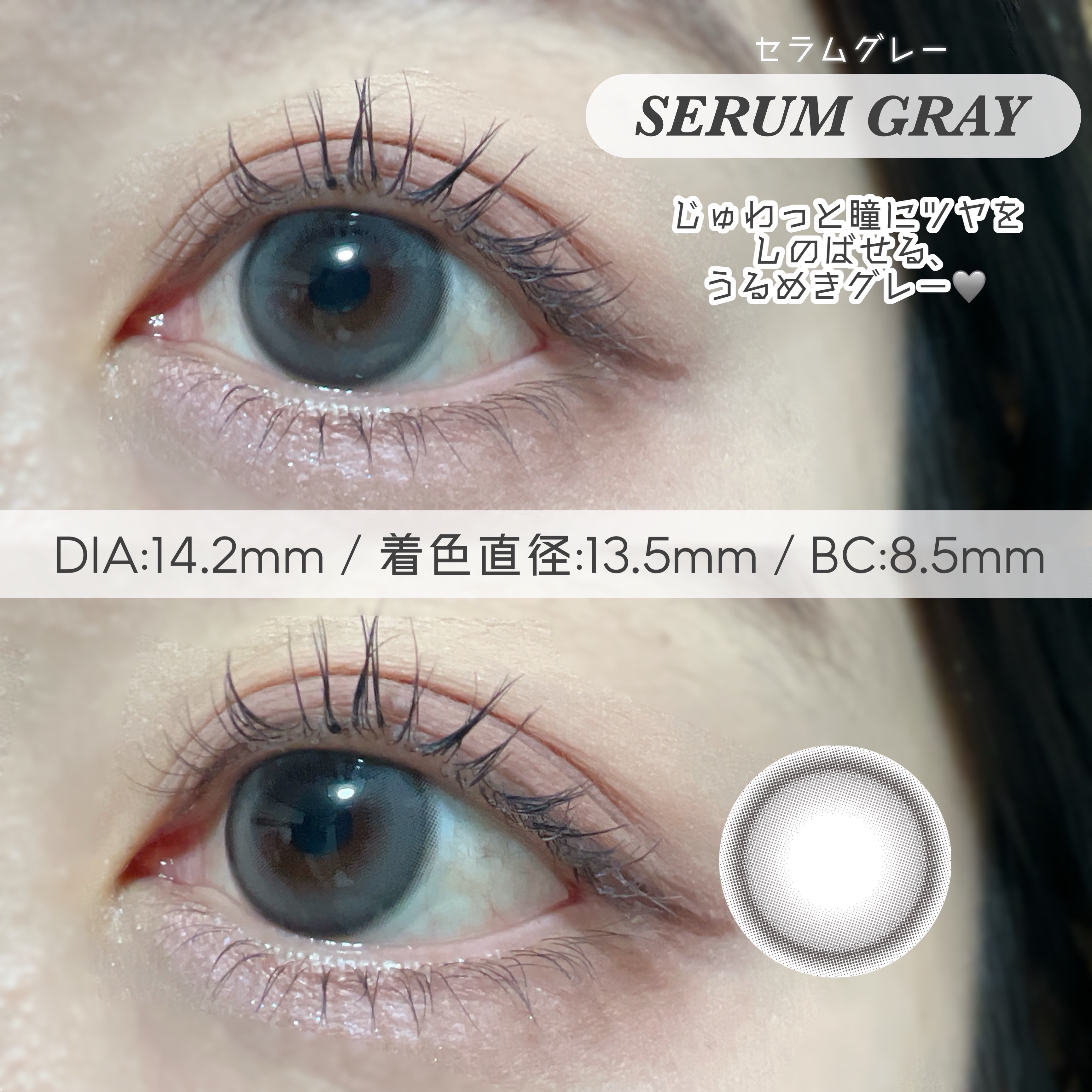 生まれつきの茶目になれるような透明感のあるナチュラルブラウンレンズ。 細フチできゅるんと見える韓国っぽデザイン!うるおいで満ちたうるめきベージュ。 じゅわっと瞳にツヤをしのばせる、うるめきグレー。