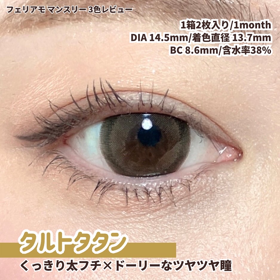 人気3カラーのマンスリータイプが出たよ〜!! ウーロンティーがめっちゃ好き!!大人も使いやすいサイズ感で、生まれつき色素薄めに見えるカラー👀✨ タルトタタンはくりっとした可愛らしい大きめの瞳を演出できる🫶🏻