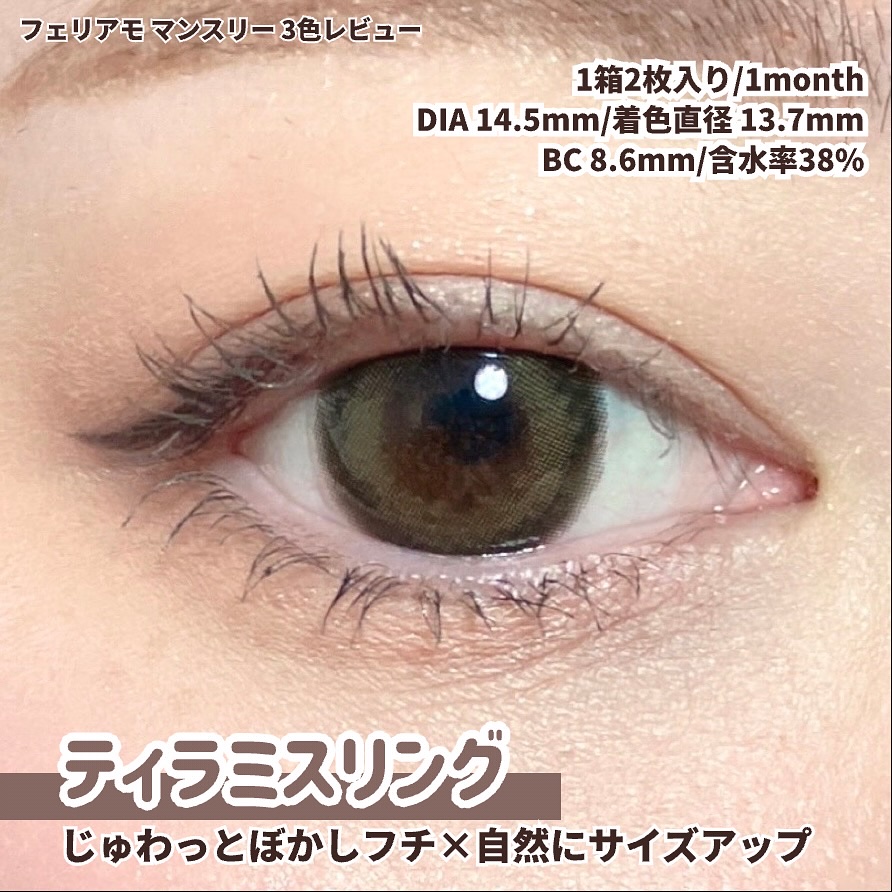 - ※2025年6月以降、商品パッケージ裏面・側面の一部表記を順次変更いたします。尚、これにかかる商品の交換・返品は承っておりません。 どんな瞬間にも溶け込む誰からも愛される瞳へ feliamoの由来は felice amore~幸せな愛~ 瞳から愛されオーラを放つ好印象レンズで女性らしさと品を演出。 オンも、オフも、特別な日も。 どんな場面にも溶け込むレンズラインナップで誰からも愛される瞳に。 ■うるつや透明感 × こっそり盛れ ナチュラルレンズ Coffee Jelly(コーヒーゼリー) ■じゅわっと透明感 × ふんわり盛れ すこし大きめレンズ Affogato(アフォガード) ■ナチュラル細フチ×裸眼盛れ トキメキうるみレンズ Oolong Tea(ウーロンティー) ■トレンド太フチ×くりっと盛れ 無敵ブラウンレンズ Tarte Tatin(タルトタタン) ■じゅわっとフチ×甘かわ盛れ あざとブラウンレンズ Tiramisu Ring(ティラミスリング) ■シュガーパール 大人気カラーBrulee Pearl(ブリュレパール)の色違いグレーレンズ! 細フチの使いやすいグレーで、どんな瞳の色(黒目・茶目)でもナチュラルに光をとりこみ、うるっと奥行きのあるこなれ可愛い印象に。 おでかけにぴったりなレンズです! 清楚な瞳になれるヒ・ミ・ツは・・・? ちゅるん細フチ×うるキラグレーカラー! ■メルティバター 盛れるのにバレにくい、毎日使えるナチュラルブラウンレンズ! じゅわっととろけるようなブラウンで、ふんわりやさしげな瞳に! どんなメイクにも似合うから毎日使える!自然に盛れる大きめブラウンレンズはfeliamoにお任せ♡ 多幸感のある印象の瞳のヒ・ミ・ツは・・・? ぼかしナチュラルブラウン×じゅんわりとろけるブラウンカラー カラーコンタクトレンズの不適正使用による眼障害の危険性等などがあります。 ●コンタクトレンズは高度管理医療機器です。不十分な洗浄・消毒など不適切なケアや、長時間・交換期間を超えた装用により、アレルギー性結膜炎、角膜感染症、角膜潰瘍等の重篤な眼障害が発生する危険性があります ●ご使用前に取扱説明書を確認してください 使用上の留意事項 ●眼科医院等を受診してからお求めください ●眼に異常を感じたら直ちにレンズ使用を中止し、お近くの眼科等で診察を受けてください ●医師の指示にしたがってご使用ください ●コンタクトレンズを装用する場合、自覚症状がなくても、眼科医院等での定期検査を受けてください ●レンズに不具合がある場合は使用しないでください