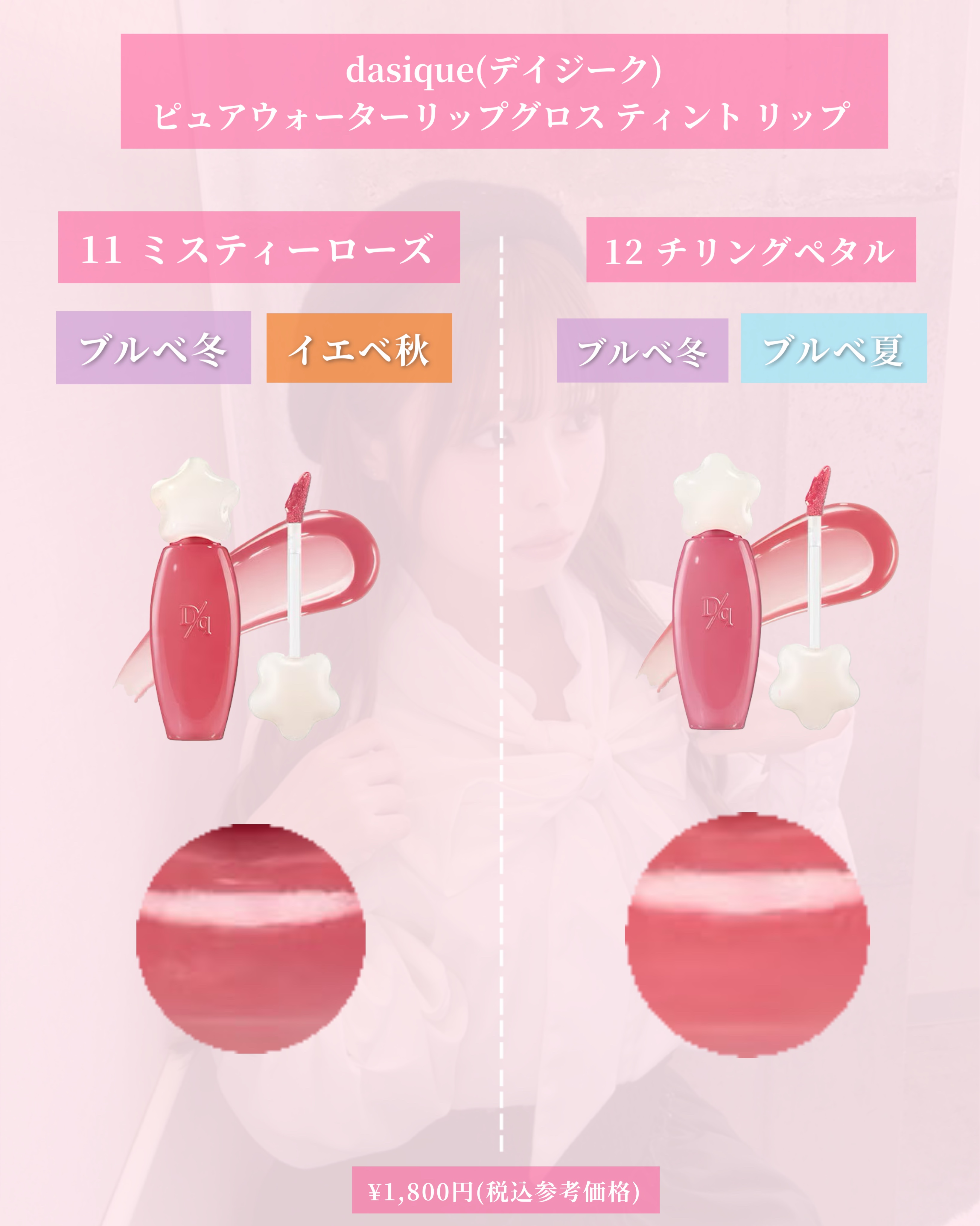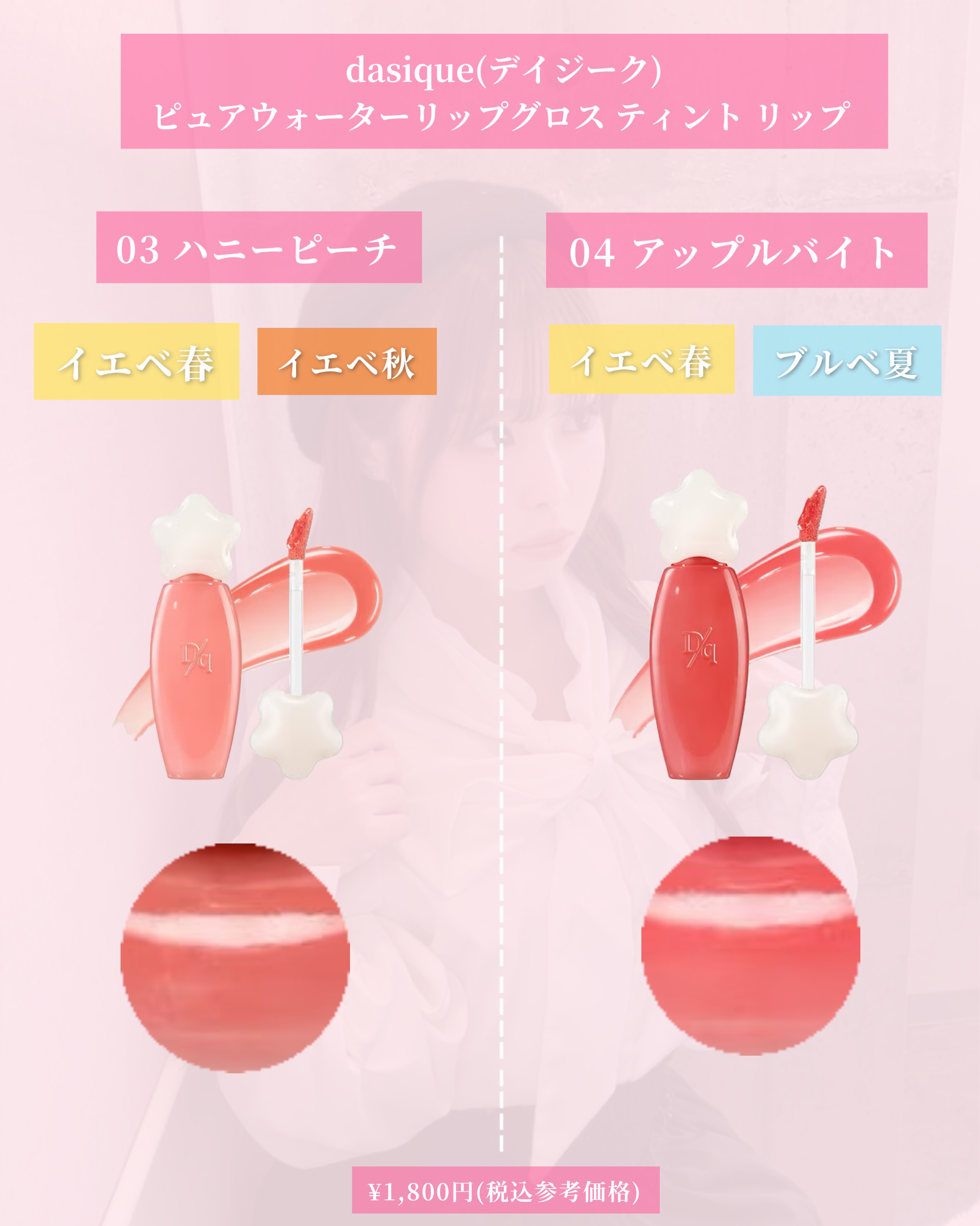 デイジークの新作リップグロスを全色パーソナルカラー分類🎨保存推奨です🎀 現時点で全14色/新色や限定色が出た時は、この投稿に追加します!🗒️ dasique ピュアウォーターリップグロス ¥1400