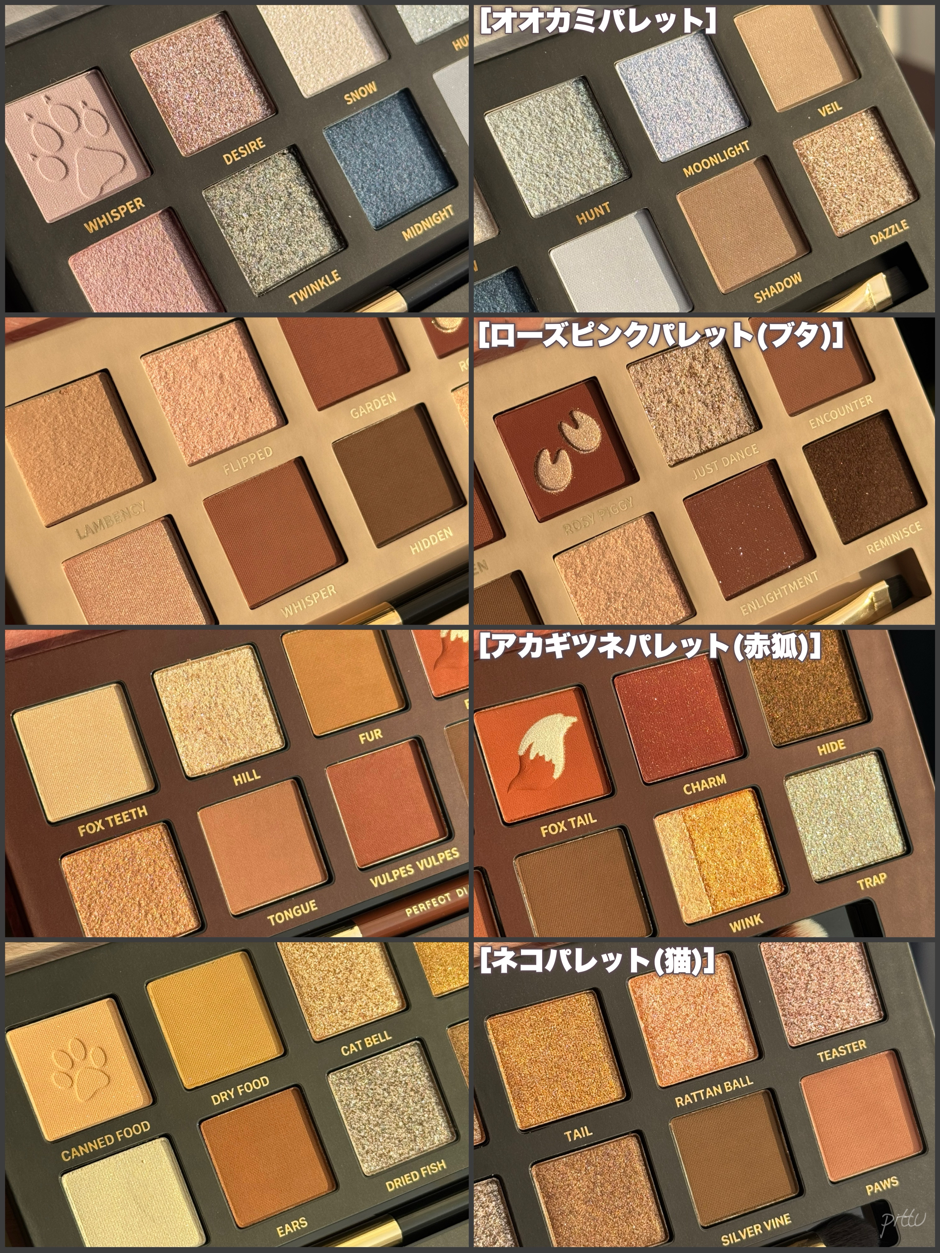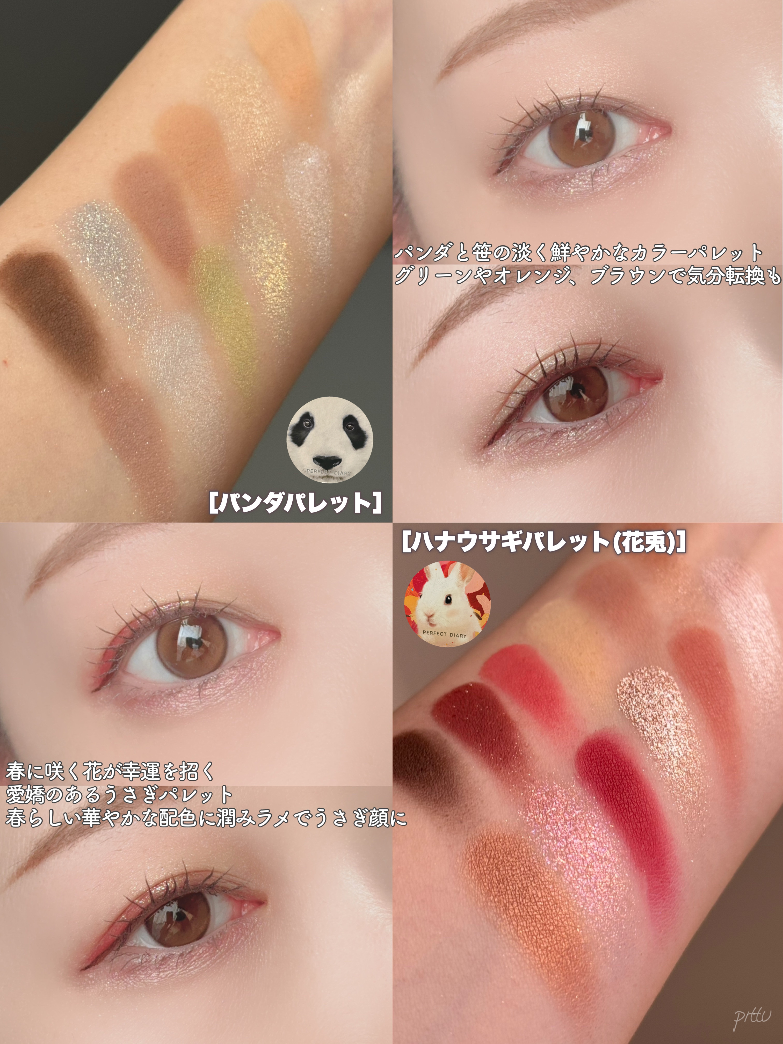 - #1.「SNSで話題になったシリーズ」 2021年のTmallで年間900万件の売り上げで、中国のSNSで超話題になりました。 #2.「4種類粉感」 滑らかマット、キラキララメ、モチモチベース状、ラメがついているマット色、多彩なカラーの組み合わせ、きめ細かい質感、肌に高密着で長持ち。 <虎> 虎からインスピレーションを受けたアニマルアイシャドウパレット。力強く活発なオレンジ・ゴールドをメインに、滑らかマット、キラキラグリッターなど多彩なテクスチャーとカラーの組合せで思い通りのメイクが完成。 <パンダ> ふんわりパンダのようなベージュ・ベビーピンクカラーや、パンダが住む竹林を表現したグリーンカラー。自由で愛らしいパンダからインスピレーションを受けたパレットで、かわいらしい印象も大人っぽい印象も1枚で叶える。 <猫> 猫からインスピレーションを受けたアニマルアイシャドウパレット。上品で落ち着いたブラウンとミステリアスなピンクパールがポイント。滑らかマット、キラキラグリッターなど多彩なテクスチャーとカラーの組合せで思い通りのメイクが完成。 <タンチョウ鶴> 鶴からインスピレーションを受けたアニマルアイシャドウパレット。使いやすいピンクベージュ系のカラーと鶴の頭をイメージした赤×白がインパクトを与える。滑らかマット、キラキラグリッターなど多彩なテクスチャーとカラーの組合せで思い通りのメイクが完成。 <赤狐> 赤狐からインスピレーションを受けたアニマルアイシャドウパレット。イエベ向きのオレンジブラウン系のカラーをメインに、滑らかマット、キラキラグリッターなど多彩なテクスチャーとカラーの組合せで思い通りのメイクが完成。狐のしっぽを再現したデザインもカワイイ。 <ラッキーラビット> うさぎからインスピレーションを受けたアニマルアイシャドウパレット。白うさぎのキュートさと透明感が再現できる赤・ピンク系の配色。滑らかマット、キラキラグリッターなど多彩なテクスチャーとカラーの組合せで思い通りのメイクが完成。 <虎&猫> 猫のしなやかさ、虎の眼光。一つのパレットで操る、二つの表情。 「猫と虎」にインスパイアされたデュアルアイメイク:「猫ルック」のしなやかな優しさ、「虎ルック」のクールな眼差し。気分に合わせて自由にスイッチ。 「ソフトブラウン × 繊細な煌めきで、優美なキャットアイを。」 「ディープスモーキー × シャープなラインで、力強いタイガーアイを。」 <オータムチェスナット> 秋の野を映し出す赤茶色と栗色のメイクで、秋冬ならではの温かみのあるカラースケールを演出。 ソフトマット、シマー、メタリックが交わり溶け合う、多彩な質感。濃厚さの中に軽やかさも。 単色でも、重ねても美しく。多様なスタイルを叶えます。