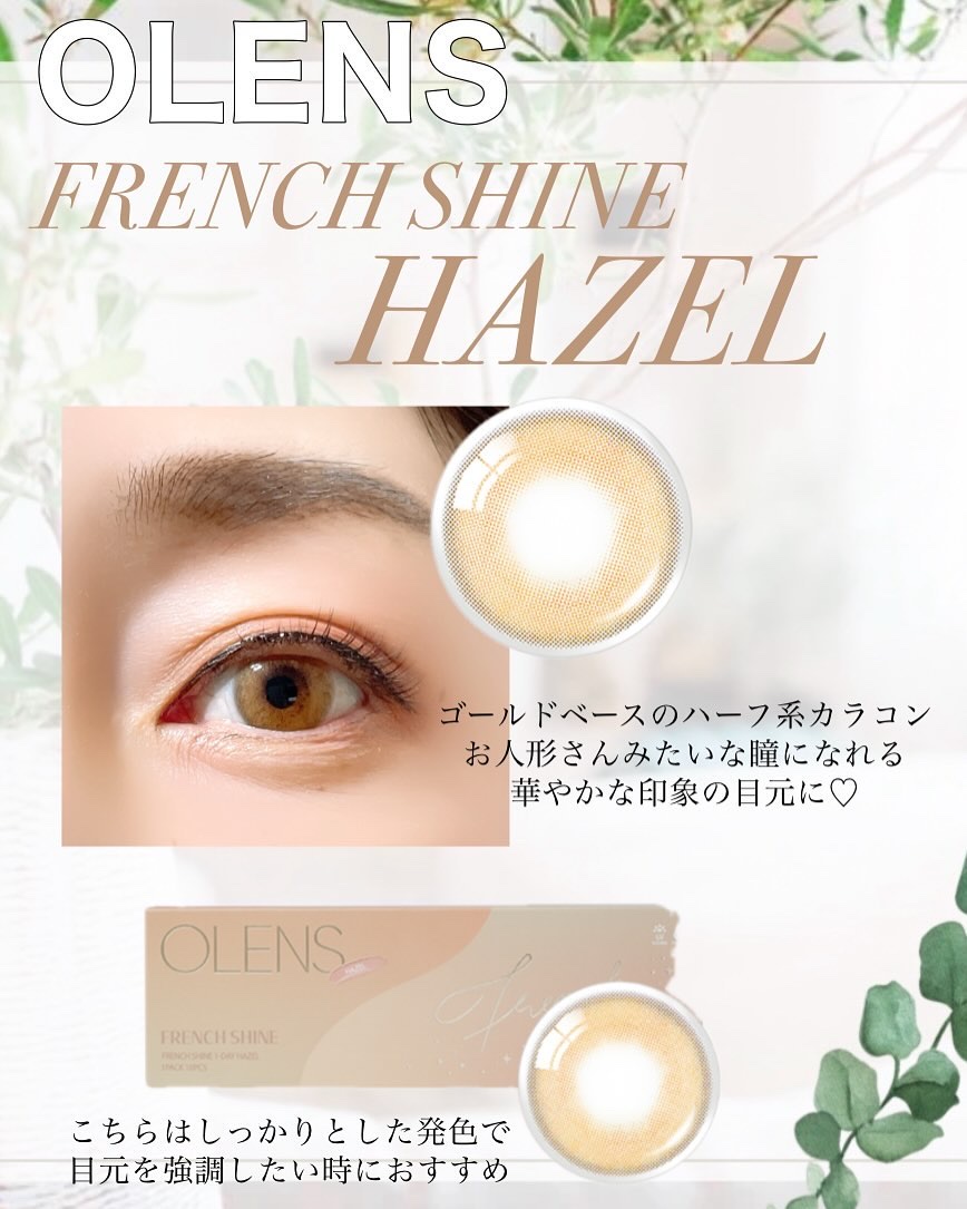 - ■OLENS French Shine(オーレンズフレンチシャイン) 韓国カラコン業界の話題のブランド『OLENS(オーレンズ)』の日本正式承認商品シリーズ。世界中から注目を浴びるグループ「NewJeans (ニュージーンズ)」がイメージモデル。そんなOLENSの新シリーズで、華やかに輝きロマンチックな瞳を演出する『FRENCH SHINE(フレンチシャイン)』が、モアコンタクトに新登場! ナチュラルでほのかに甘いゴールドベースのパステルカラーが瞳にほんのり溶け込むように馴染み、やわらかな輝きを生み出します。 着色直径は13.2mmと裸眼に馴染みやすい4色展開で、煌びやかながらもどこかノスタルジックであたたかな瞳を演出します。 ■使い方 コンタクトレンズは高度管理医療機器です。必ず眼科医の処方に従って購入してください。 ■使用上の留意事項 コンタクトレンズは高度管理医療機器です。眼科医の指導に従い装用期間を厳守し、正しくお使いください。眼の定期検査を必ず受けてください。添付文書を必ず読み、取扱方法、装用時間を守って正しくお使いください。少しでも異常を感じたら、直ちに眼科医の検査を受けてください。