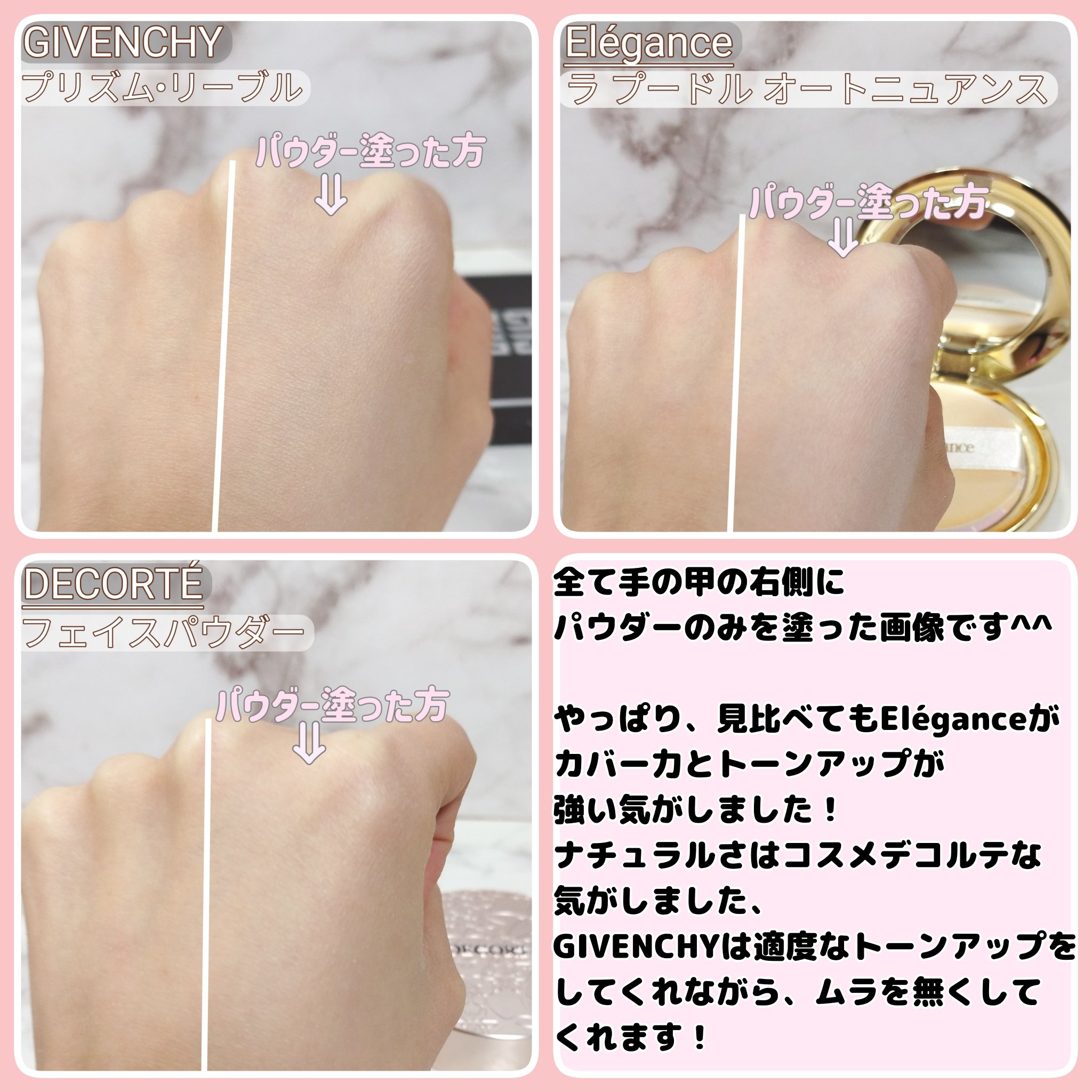 しっとり感 DECORTÉ>>>>GIVENCHY=Elégance 個人的に日常生活に最も溶け込んでくれるアイテム 他に使うベースアイテムによりますが、素肌感を残すことができます もう5年以上使っている大好きなアイテム デパコスのお粉すごい!と初めて思わせくれた記念すべきパウダーです✨️