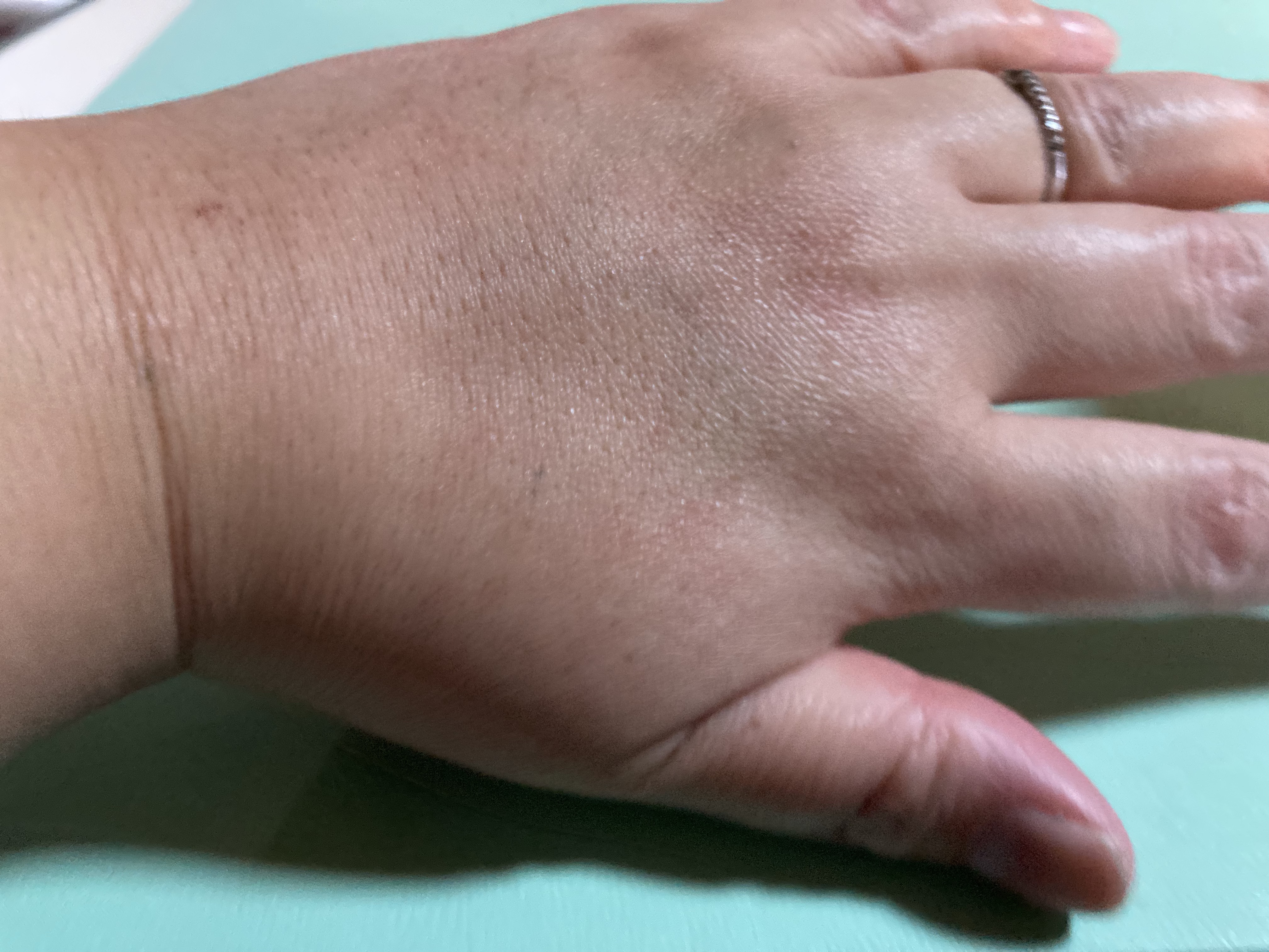 手に出してみた感じ凄くサラッとした感じでした。 写真にはたっぷり出してみたのですが、ここまで出したら、腕全体伸ばして余るかもです笑 伸ばした後もベタつきもなくスーッと馴染んでました。 その後手が白く透明感が出た気がするのは私だけでしょうか?笑 娘と一緒に使います!