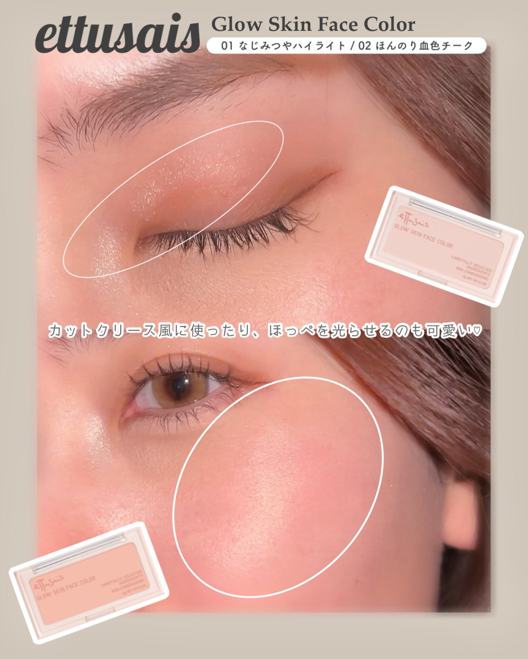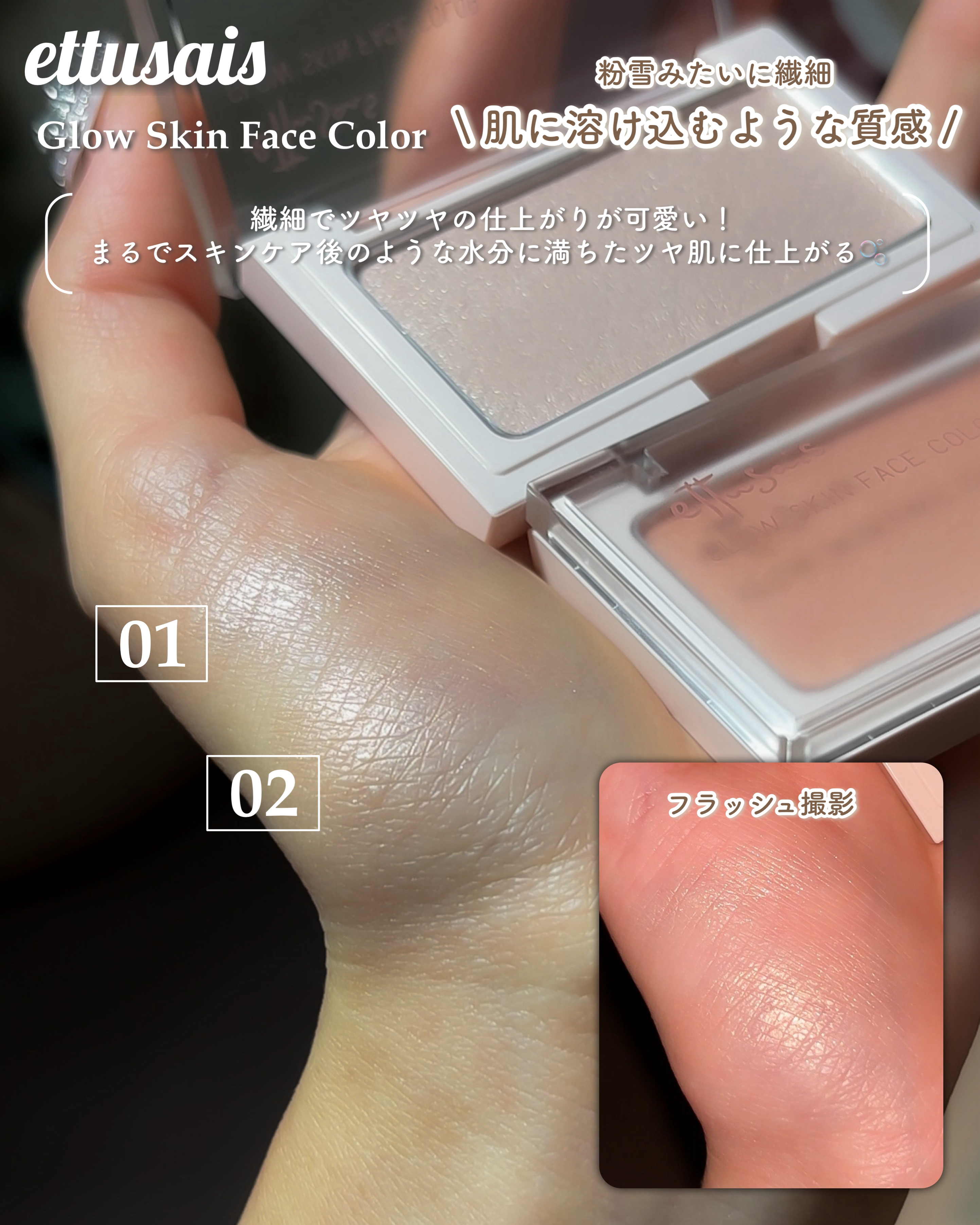 エテュセのフェイスカラー、待ってましたー!! もうね、ほんとうに使用感がよかった✨ うるおいが長時間続くスキンケア仕立てでテクスチャーだけでなく肌もしっとりが続く🫧 01 なじみつやハイライト 繊細な輝きでうるおったツヤ肌を演出 白浮しないピンクベージュ♡