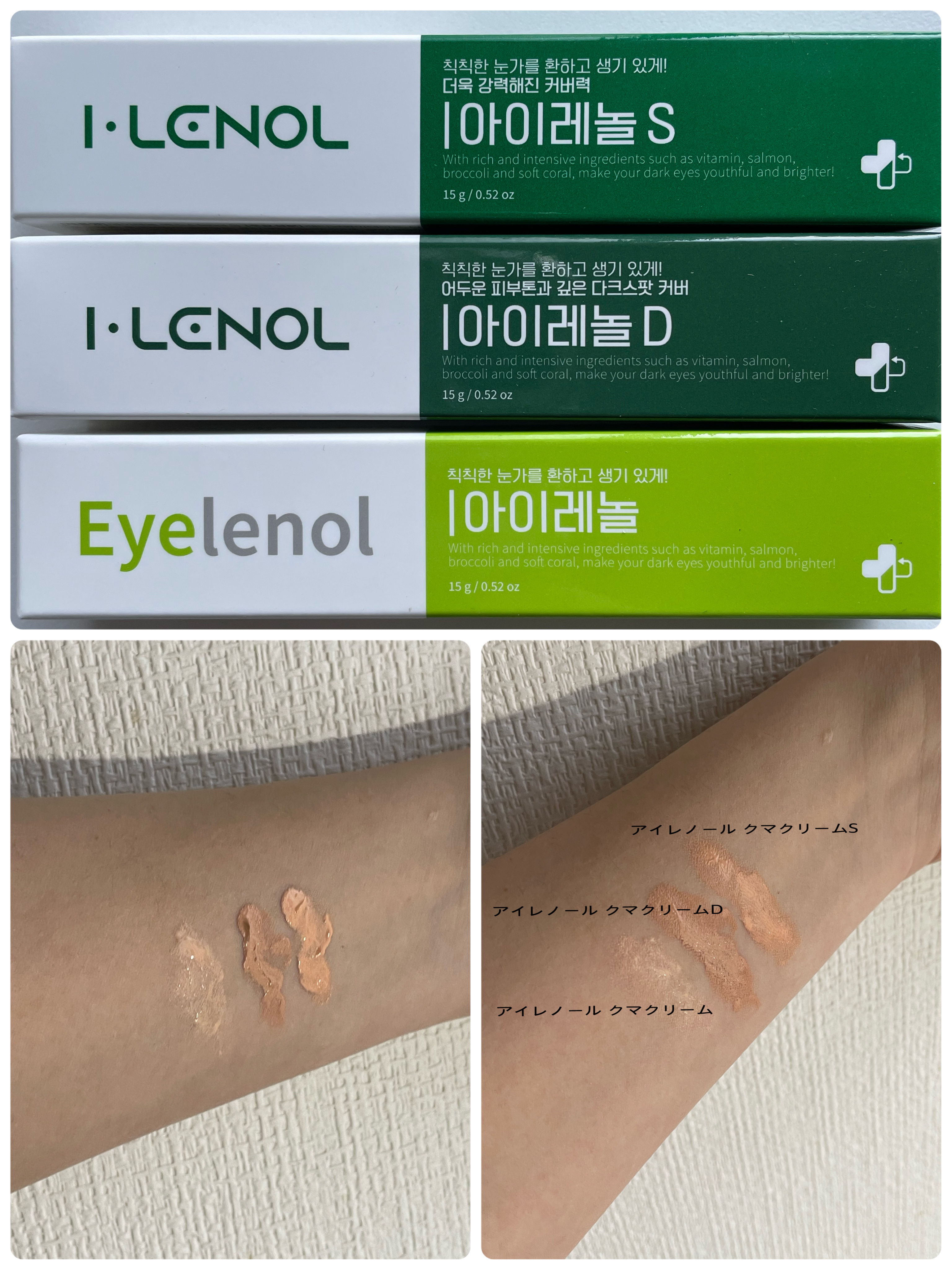 - <アイレノール クマクリーム> 水、シクロペンタシロキサン、グリセリン、ナイアシンアミド、ツボクサ葉エキス、サンゴエキス、パンテノール、イソヘキサデカン、ヒドロキシエチルウレア、ジメチコノール、アラントイン、グリチルリチン酸2K、プロパンジオール、カプリルヒドロキサム酸、香料、オリーブ果実油、酢酸トコフェロール、ホホバ種子油、オレイン酸ソルビタン、アルガニアスピノサ核油、アデノシン、エチルヘキシルグリセリン、プルラン、ヒアルロン酸Na、EDTA-2Na、トリデセス-6、DNA-Na、(アクリル酸グリセリル/アクリル酸)コポリマー、リノール酸グリセリル、ペンチレングリコール、リノレン酸グリセリル、アラキドン酸グリセリル、パルミチン酸レチノール、ラウリン酸K、ピーナッツ油、ヒアルロン酸クロスポリマーNa、トマト果実エキス、ブロッコリーエキス、ケール葉エキス、キャベツ葉エキス、チャ葉エキス、レモン果実エキス、アスパラガスエキス、フラガリアチロエンシス果実エキス、カキ葉エキス、トウガラシ果実エキス、水溶性プロテオグリカン、アスタキサンチン、ヒアルロン酸、トコフェロール、パルミチン酸アスコルビル、酸化チタン、酸化鉄、他 <アイレノール クマクリームS> 水、シクロペンタシロキサン、グリセリン、ナイアシンアミド、ツボクサ葉エキス、サンゴエキス、パンテノール、イソヘキサデカン、ヒドロキシエチルウレア、ジメチコノール、アラントイン、グリチルリチン酸2K、プロパンジオール、カプリルヒドロキサム酸、香料、オリーブ果実油、酢酸トコフェロール、ホホバ種子油、オレイン酸ソルビタン、アルガニアスピノサ核油、アデノシン、エチルヘキシルグリセリン、プルラン、ヒアルロン酸Na、EDTA-2Na、トリデセス-6、DNA-Na、(アクリル酸グリセリル/アクリル酸)コポリマー、リノール酸グリセリル、ペンチレングリコール、リノレン酸グリセリル、アラキドン酸グリセリル、パルミチン酸レチノール、ラウリン酸K、ピーナッツ油、ヒアルロン酸クロスポリマーNa、トマト果実エキス、ブロッコリーエキス、ケール葉エキス、キャベツ葉エキス、チャ葉エキス、レモン果実エキス、アスパラガスエキス、フラガリアチロエンシス果実エキス、カキ葉エキス、トウガラシ果実エキス、水溶性プロテオグリカン、アスタキサンチン、ヒアルロン酸、トコフェロール、パルミチン酸アスコルビル、酸化チタン、酸化鉄、他