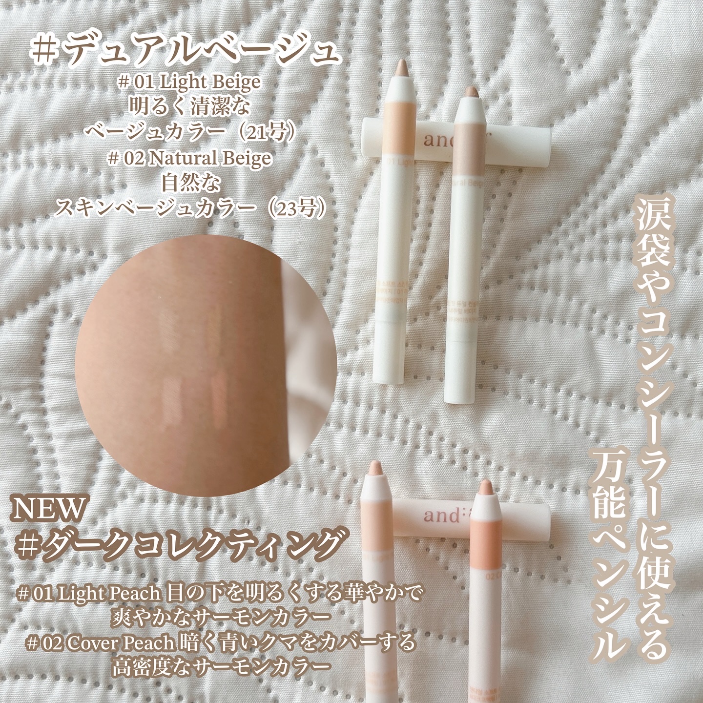 ムードに合わせて多様に演出🩷 好きなものを自分らしく表現🩷 クールカラーとウォームカラーが1つのパレットに♡♡♡ マットカラーの粉質はやわらかく重ねても綺麗に💖💖 1本で2つの効果を実現簡単にクマをカバーしながら涙袋を明るく演出してくれるよ⋆✦