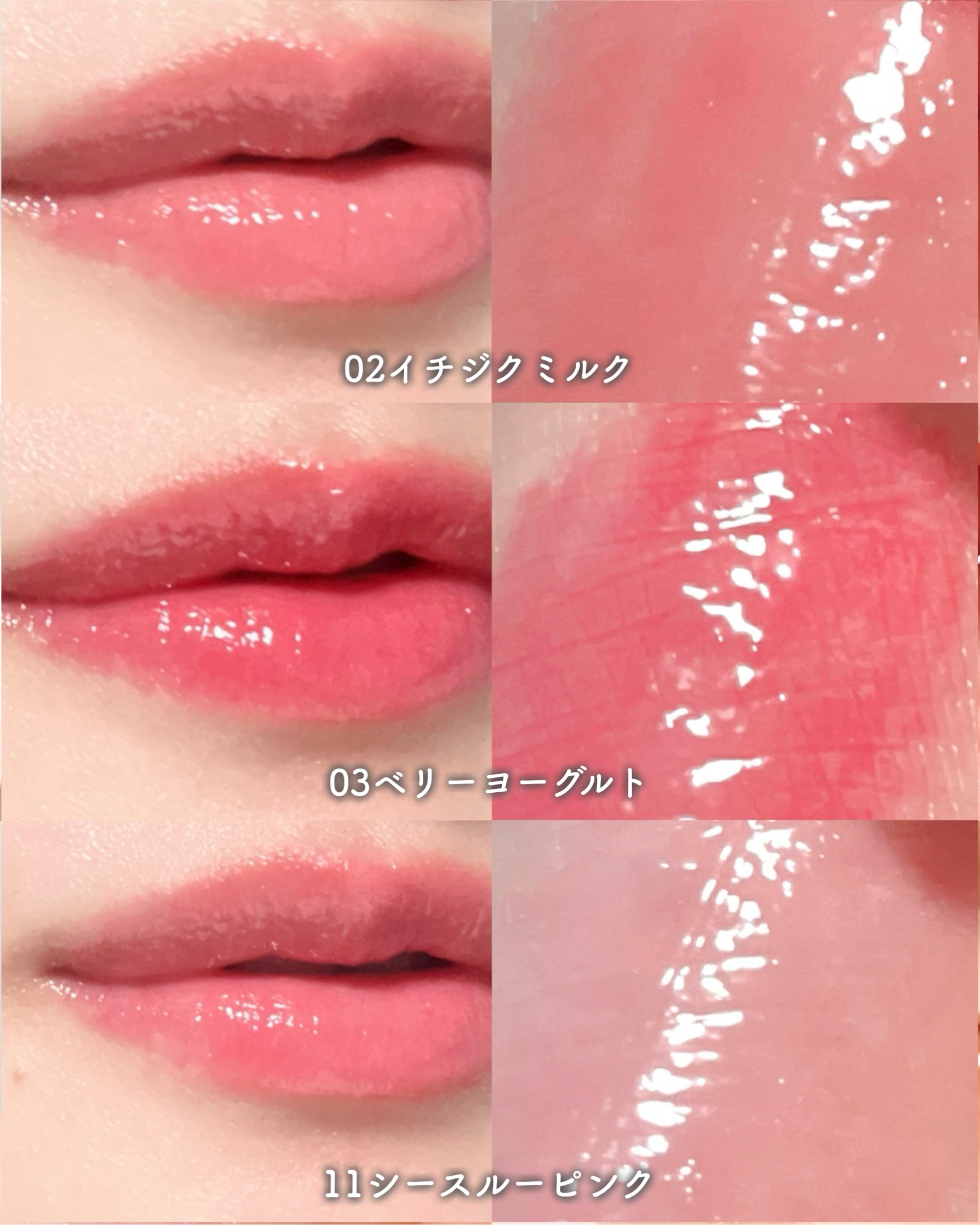 むちぷる唇になれるハニーメルティングリップ💋 自分のパソカで選べるカラーリップ♡ 🍑02 イチジクミルク 🍓03 ベリーヨーグルト ムードチェンジできるプランパーリップ♡ 🩷11 シースルーピンク 🩶12 シースルーグレー キラキラグリッターが可愛すぎリップ♡ 🦄13 オーロラグリッター 🍯14 メープルグリッター