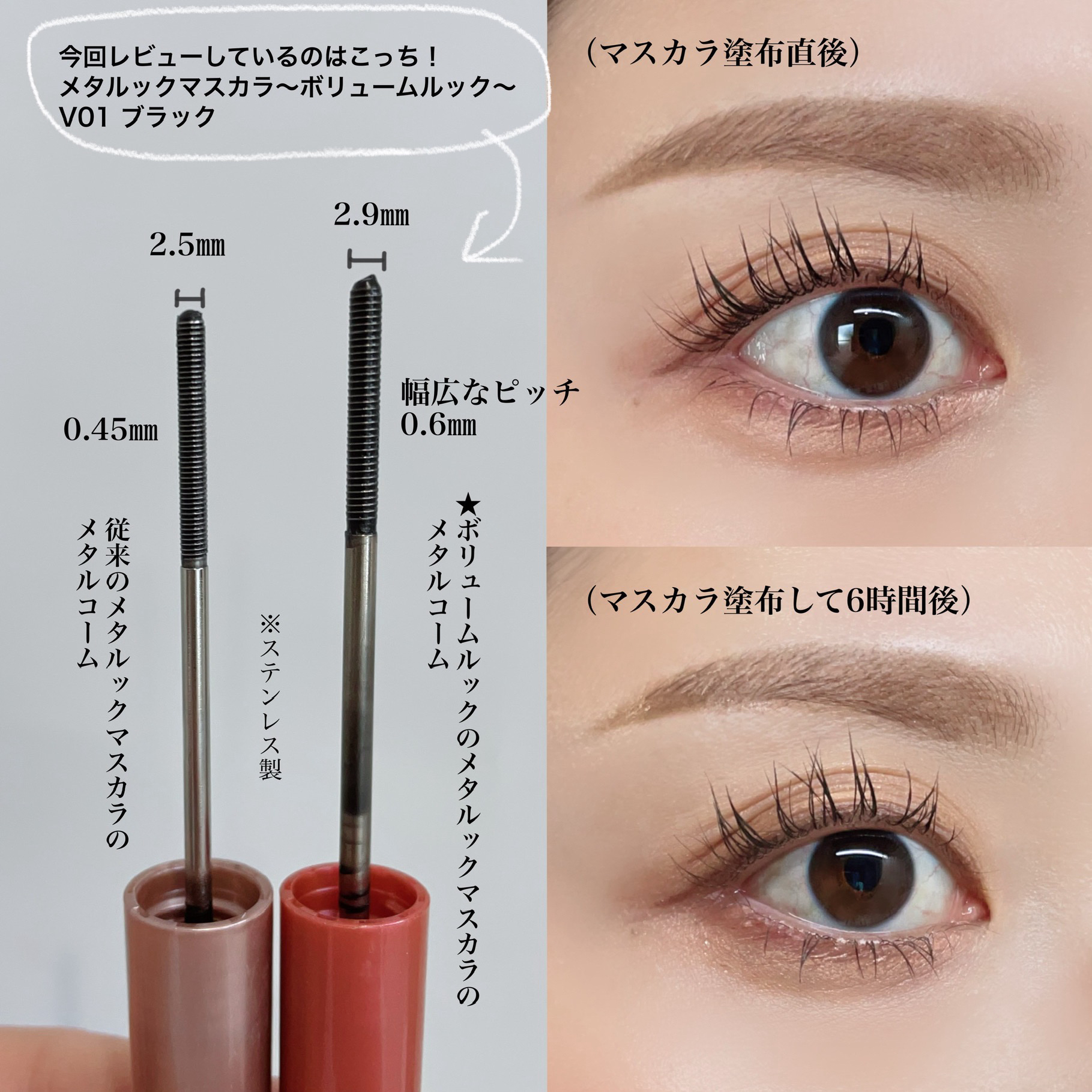 - しっかり目力の束感まつげに♡ メタルックマスカラのボリュームタイプ ピッチが広くなったメタルコームがまつげをたっぷりキャッチ👀! ボリュームのある贅沢な束感まつげが叶います。 まつげにスッと塗れるので、 ボリューム仕上がりにありがちなダマダマ感が無く、 重ねてもキレイな仕上がりに♪ 水・汗・皮脂に強く、にじみにくい処方で大事な日もキレイなまつげをキープ◎