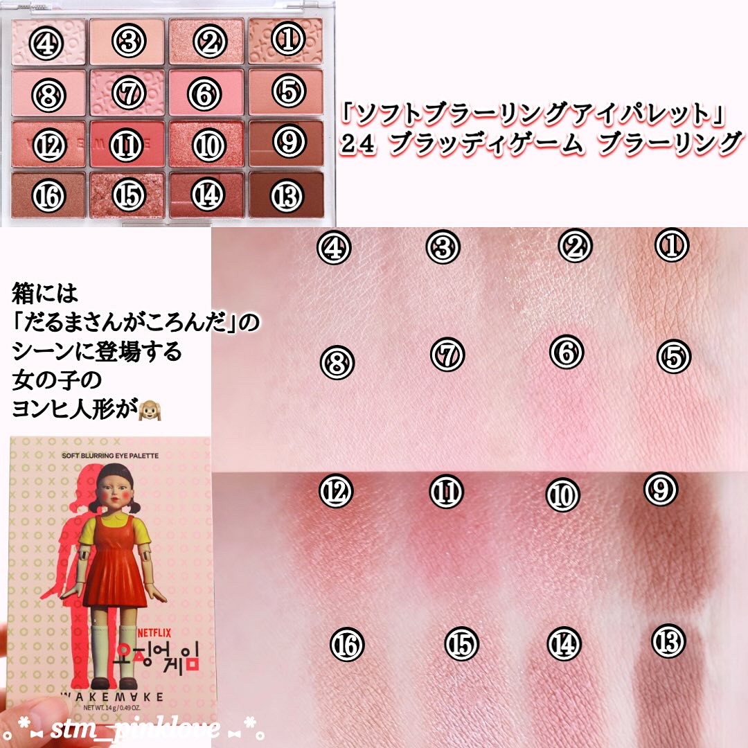 Netflix『イカゲーム』シーズン2 コラボレーションエディションを発売🦑 ヨンヒの無邪気さを表現したピンクカラーやゲームの中のブラッディローズカラーを表現した「ソフトアイパレット」 ヨンヒの唇をモチーフにした「デュイジェルグレーズスティック」を購入しました🥰 イカゲームもWAKEMAKEも大好きなので嬉しいです💓