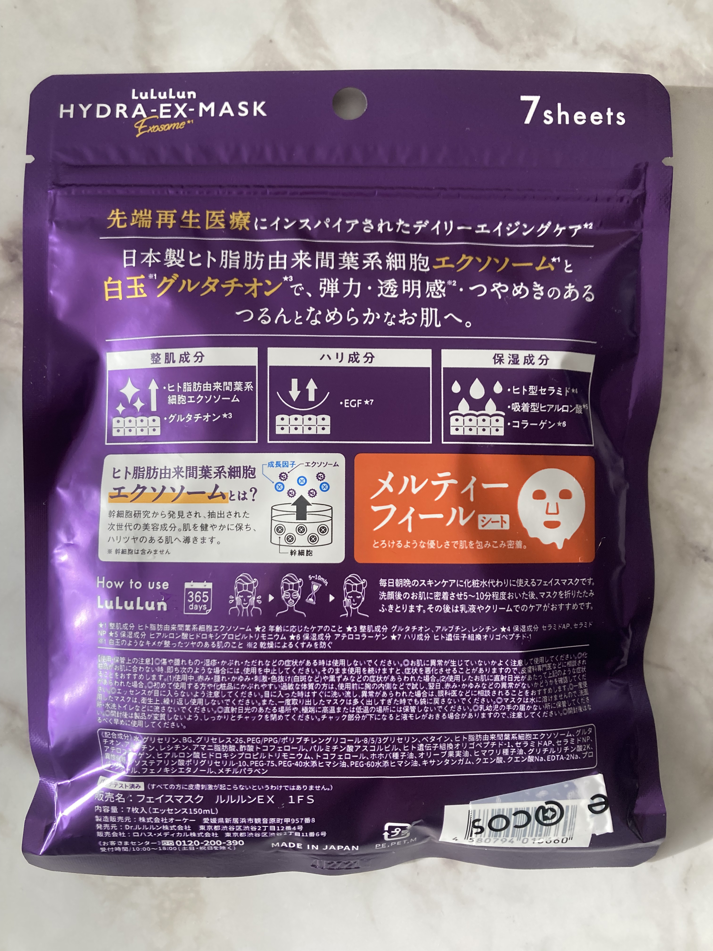 今流行りのエクソソーム⚡️ 何に効果あるのかよく分からないけどどうやらるルルルンからエクソソーム配合のフェイスマスクが発売されているぽいのでマツキヨで購入してみました😉😉 メルティーフィールシート?という特殊なデザインを採用しているらしくて肌に溶け込むような着け心地がかなり初体験すぎて気持ちよかったです😳💕 エクソソーム入りのフェイスマスクを7枚入りで1,000円以下でお試しできるって考えると試す価値はあるかも🙆♀️🙆♀️