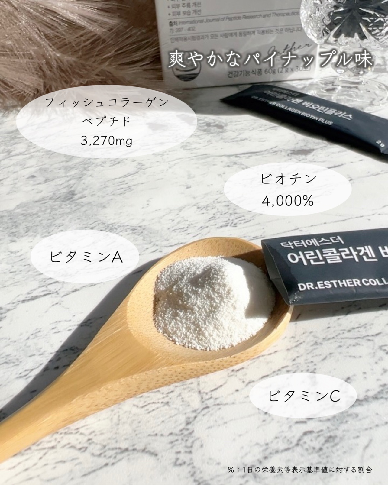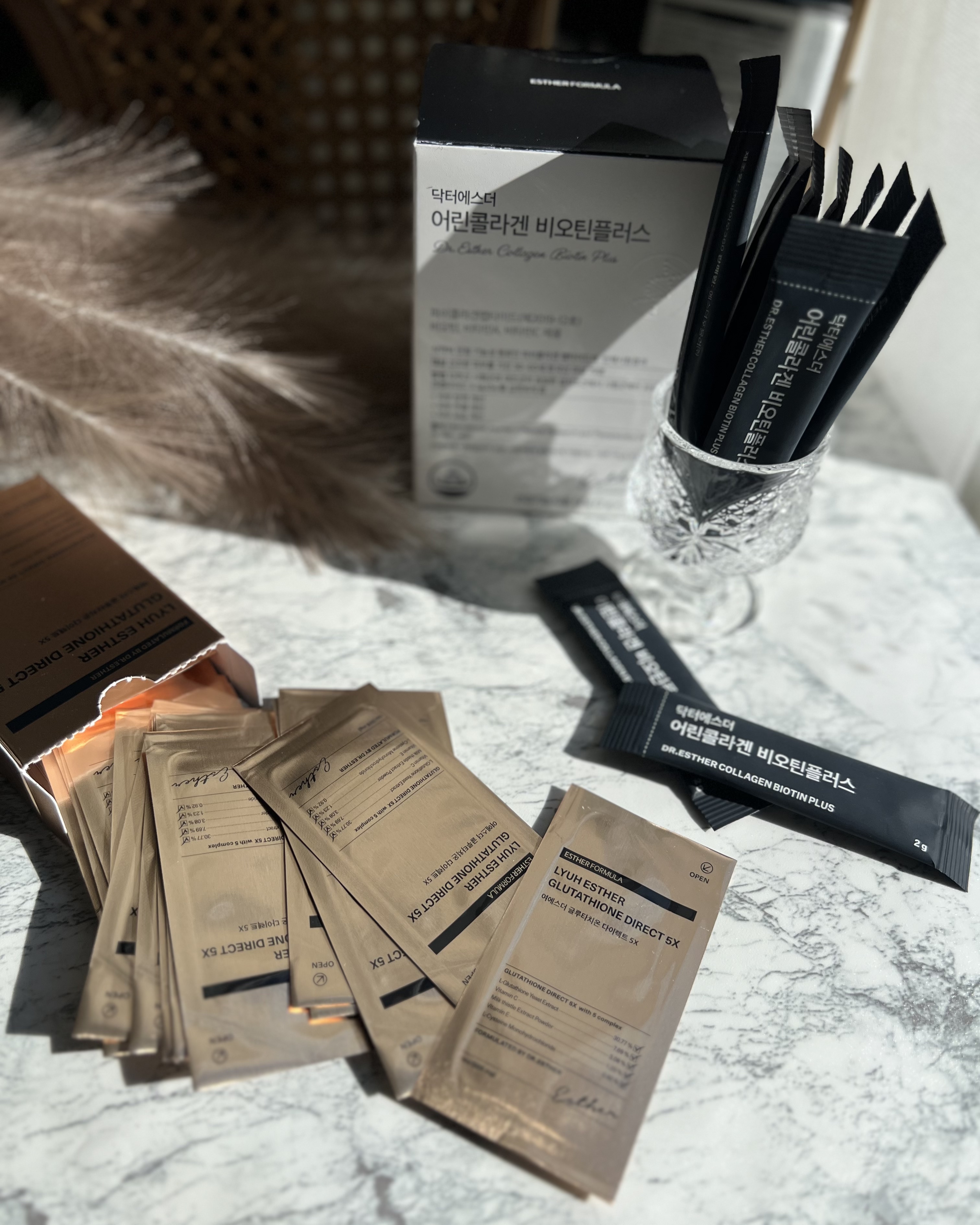 エスターフォーミュラは「私の家族が摂取できる健康機能食品を作る」という哲学を基に、インナービューティーから健康に役立つサプリまで現代人に不足しがちな栄養素を固有の配合比で製造し販売するブランド🌟 ヨエスターGLTダイレクト5X口腔溶解フィルム(ODF)で作られて純度75%以上のグルタチオンの吸収率を上げる作りになってるよ◎ ドクターエスター魚鱗コラーゲンビオチンプラスコラーゲンとビオチンを一緒に摂取できるパウダーサプリ💊今回初めて飲んだけどパイナップル🍍味でさっぱり!