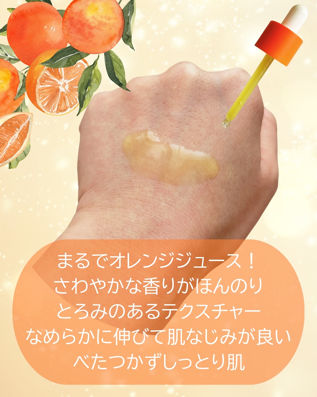 - 精製水の代わりにオレンジエキス*を72%も配合した肌に潤いを与え、ハリのある肌に導くセラムです。さらに、整肌成分としてビタミンCと2種類のビタミンC誘導体、ナイアシンアミド、アルブチンなど年齢肌の乾燥悩みケアや肌荒れ予防が期待できる成分も配合。まるでオレンジジュースかのような植物本来のカラーを引き出し、香りは柑橘系フルーツ本来の香りそのままをお届けします。さらっとした使い心地かつ低刺激処方で、すべての肌タイプの方にご使用いただけます。 *保湿成分