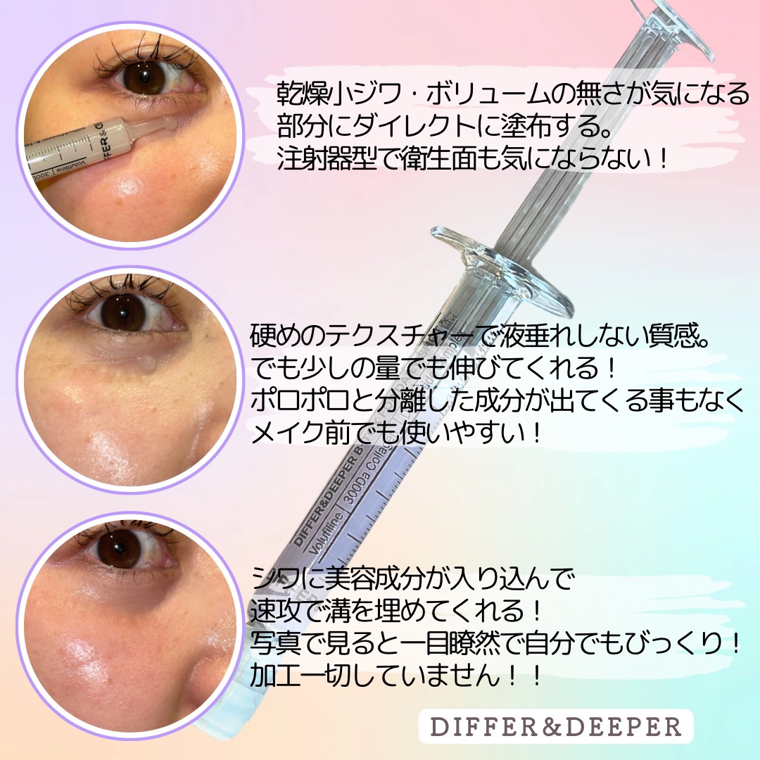 たるみの気になる肌にボリュームを! 深いシワも即引き締めてくれる! ベタつかないので朝使ってもメイク崩れの心配なし✨ 注射器のデザインが可愛い💉🤍 1本で2、3回使える&保存しやすいのでデイリーで改善、予防出来ます✨
