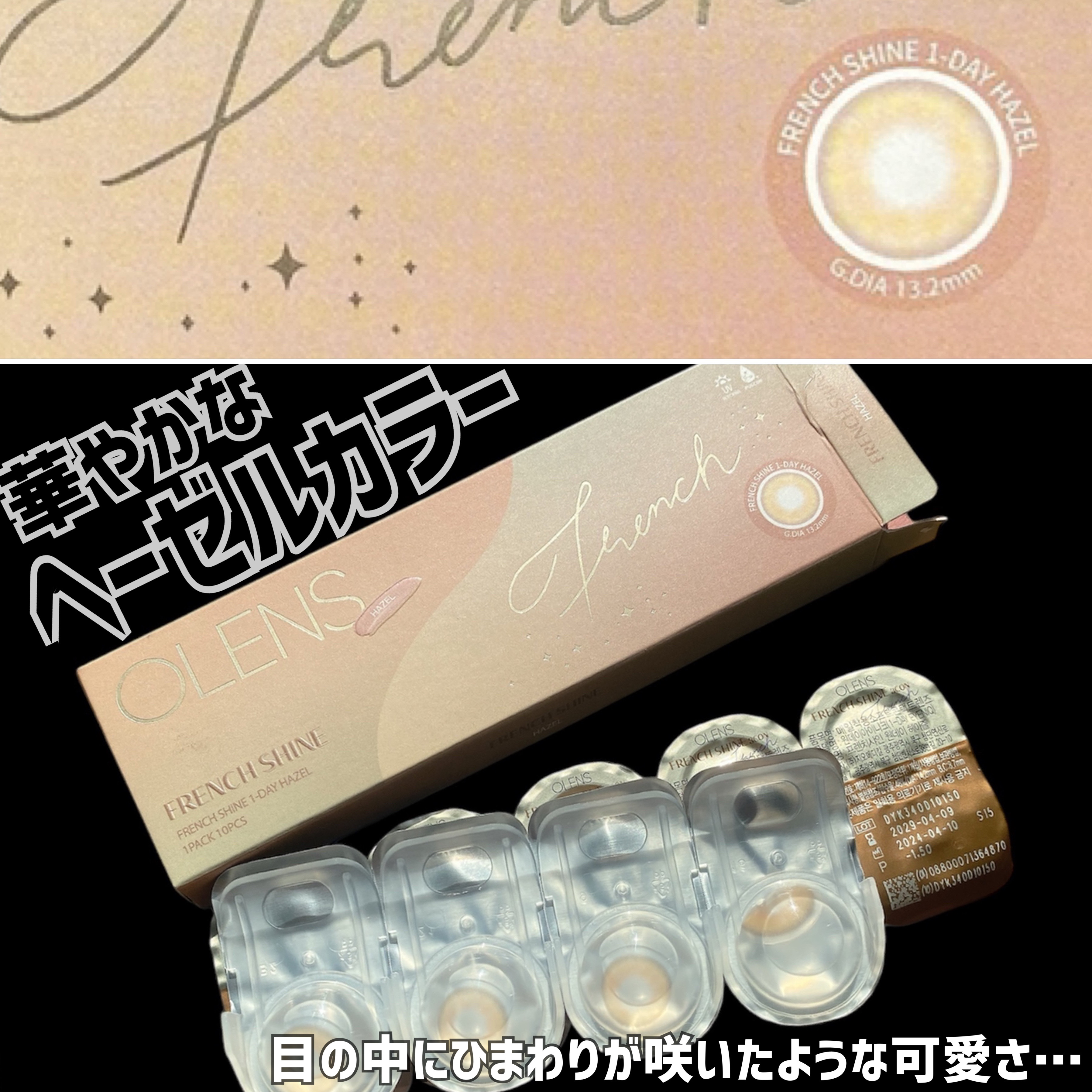 - ■OLENS French Shine(オーレンズフレンチシャイン) 韓国カラコン業界の話題のブランド『OLENS(オーレンズ)』の日本正式承認商品シリーズ。世界中から注目を浴びるグループ「NewJeans (ニュージーンズ)」がイメージモデル。そんなOLENSの新シリーズで、華やかに輝きロマンチックな瞳を演出する『FRENCH SHINE(フレンチシャイン)』が、モアコンタクトに新登場! ナチュラルでほのかに甘いゴールドベースのパステルカラーが瞳にほんのり溶け込むように馴染み、やわらかな輝きを生み出します。 着色直径は13.2mmと裸眼に馴染みやすい4色展開で、煌びやかながらもどこかノスタルジックであたたかな瞳を演出します。 ■使い方 コンタクトレンズは高度管理医療機器です。必ず眼科医の処方に従って購入してください。 ■使用上の留意事項 コンタクトレンズは高度管理医療機器です。眼科医の指導に従い装用期間を厳守し、正しくお使いください。眼の定期検査を必ず受けてください。添付文書を必ず読み、取扱方法、装用時間を守って正しくお使いください。少しでも異常を感じたら、直ちに眼科医の検査を受けてください。