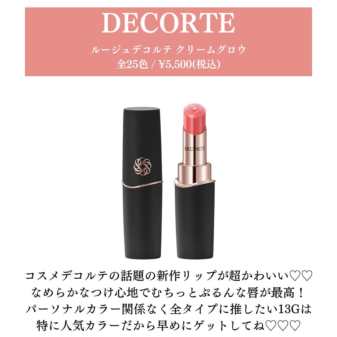 2025年1月16日発売のルージュデコルテ クリームグロウ💄 新アイコンリップと噂の話題のリップをパーソナルカラー別に紹介します✨ イエベ春の私は01Gと11Gが気になってる💭💕 予約は12月16日〜!ぜひ参考にしてみてください❤️ 📝 コスメデコルテ ルージュデコルテ クリームグロウ 全25色 / ¥5,500(税込)