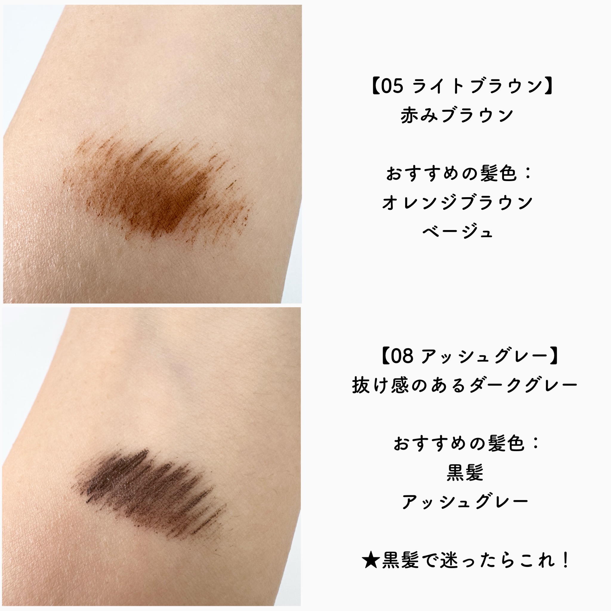 - <01 イエローブラウン> 水、アクリレーツコポリマーアンモニウム、PG、エタノール、ケイ酸(Al/Mg)、タルク、キサンタンガム、シリカ、パンテノール、加水分解シルク、フェノキシエタノール、デヒドロ酢酸Na、メチルパラベン、三リン酸5Na、EDTA-2Na、酸化鉄、マイカ、酸化チタン <03 アッシュブラウン> 水、アクリレーツコポリマーアンモニウム、PG、エタノール、ケイ酸(Al/Mg)、タルク、キサンタンガム、シリカ、パンテノール、加水分解シルク、フェノキシエタノール、デヒドロ酢酸Na、メチルパラベン、水酸化Al、三リン酸5Na、EDTA-2Na、酸化鉄、酸化チタン、マイカ <04 ナチュラルブラウン> 水、アクリレーツコポリマーアンモニウム、PG、エタノール、ケイ酸(Al/Mg)、タルク、キサンタンガム、シリカ、パンテノール、加水分解シルク、フェノキシエタノール、デヒドロ酢酸Na、メチルパラベン、三リン酸5Na、EDTA-2Na、酸化鉄、マイカ、酸化チタン <05 ライトブラウン> 水、アクリレーツコポリマーアンモニウム、PG、エタノール、ケイ酸(Al/Mg)、タルク、キサンタンガム、シリカ、パンテノール、加水分解シルク、フェノキシエタノール、デヒドロ酢酸Na、メチルパラベン、三リン酸5Na、EDTA-2Na、酸化鉄、マイカ、酸化チタン、グンジョウ <08 アッシュグレー> 水、アクリレーツコポリマーアンモニウム、PG、エタノール、ケイ酸(Al/Mg)、タルク、キサンタンガム、シリカ、パンテノール、加水分解シルク、フェノキシエタノール、デヒドロ酢酸Na、メチルパラベン、三リン酸5Na、水酸化Al、EDTA-2Na、マイカ、酸化鉄、酸化チタン <09 ナチュラルアッシュ> 水、アクリレーツコポリマーアンモニウム、PG、エタノール、ケイ酸(Al/Mg)、タルク、キサンタンガム、シリカ、パンテノール、加水分解シルク、フェノキシエタノール、デヒドロ酢酸Na、メチルパラベン、三リン酸5Na、水酸化Al、EDTA-2Na、マイカ、酸化鉄、酸化チタン <12 グレイッシュベージュ> 水、アクリレーツコポリマーアンモニウム、PG、エタノール、ケイ酸(Al/Mg)、タルク、キサンタンガム、シリカ、パンテノール、加水分解シルク、フェノキシエタノール、デヒドロ酢酸Na、メチルパラベン、水酸化Al、三リン酸5Na、EDTA-2Na、酸化チタン、酸化鉄、マイカ <13 マイルドブラウン> 水、アクリレーツコポリマーアンモニウム、PG、エタノール、ケイ酸(Al/Mg)、タルク、キサンタンガム、シリカ、パンテノール、加水分解シルク、フェノキシエタノール、デヒドロ酢酸Na、メチルパラベン、三リン酸5Na、水酸化Al、EDTA-2Na、酸化鉄、マイカ、酸化チタン <14 シフォンベージュ> 水、アクリレーツコポリマーアンモニウム、PG、エタノール、ケイ酸(Al/Mg)、タルク、キサンタンガム、シリカ、パンテノール、加水分解シルク、フェノキシエタノール、デヒドロ酢酸Na、メチルパラベン、水酸化Al、三リン酸5Na、EDTA-2Na、酸化チタン、酸化鉄、マイカ <15 ダスキーローズ> 水、アクリレーツコポリマーアンモニウム、PG、エタノール、ケイ酸(Al/Mg)、タルク、キサンタンガム、シリカ、パンテノール、加水分解シルク、フェノキシエタノール、デヒドロ酢酸Na、メチルパラベン、三リン酸5Na、水酸化Al、EDTA-2Na、マイカ、酸化チタン、酸化鉄