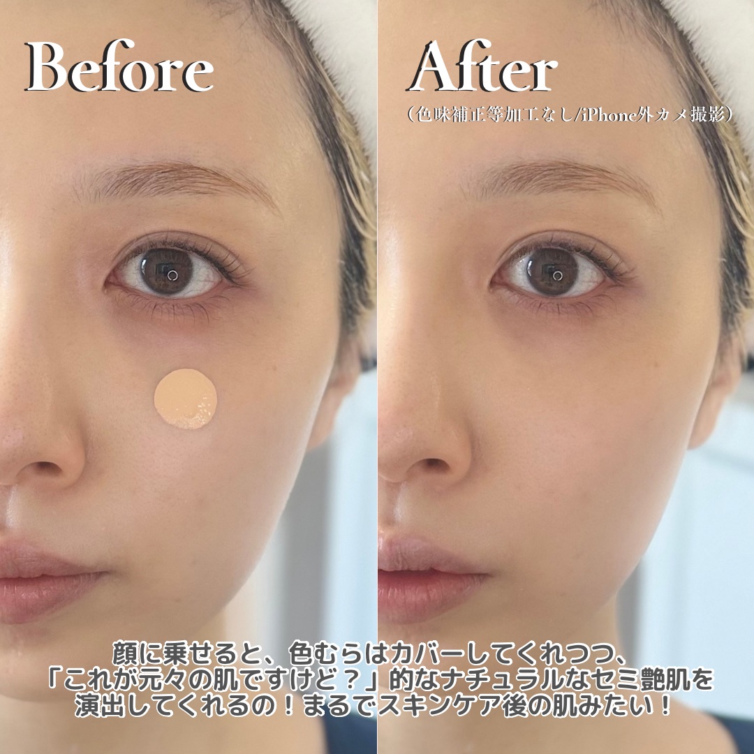 ツヤツヤ過ぎずマットでもない素肌っぽい仕上がり。人工的なツヤが苦手〜って思ってたナチュラルメイク派さんに推したい質感! 超薄づきで指でも綺麗に伸ばせる🫶🏻 ファンデ塗りながら美容液塗ってるみたいな心地良さだから長時間の外出に良さそう。 これはカラバリ12色もあるからドンピシャなカラーが見つかるはず〜〜!