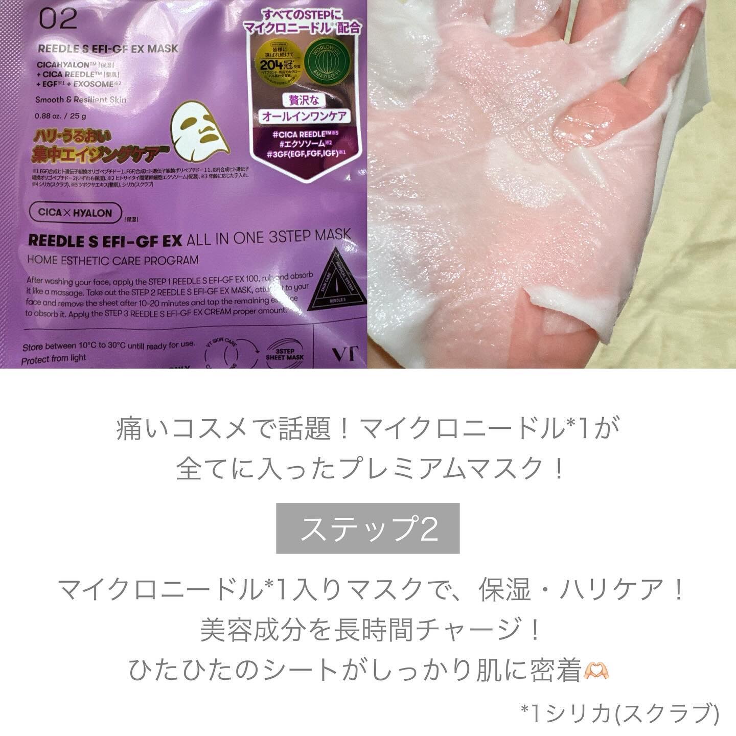 すべてのステップにマイクロニードル*1が入っているマスクです。 とてもトロトロで美容液がたくさん入ったマスクでした。保湿、肌にハリを与えるのによいですね。 しっとりした感じで、3ステップなので、スペシャルケアによさそうですね!