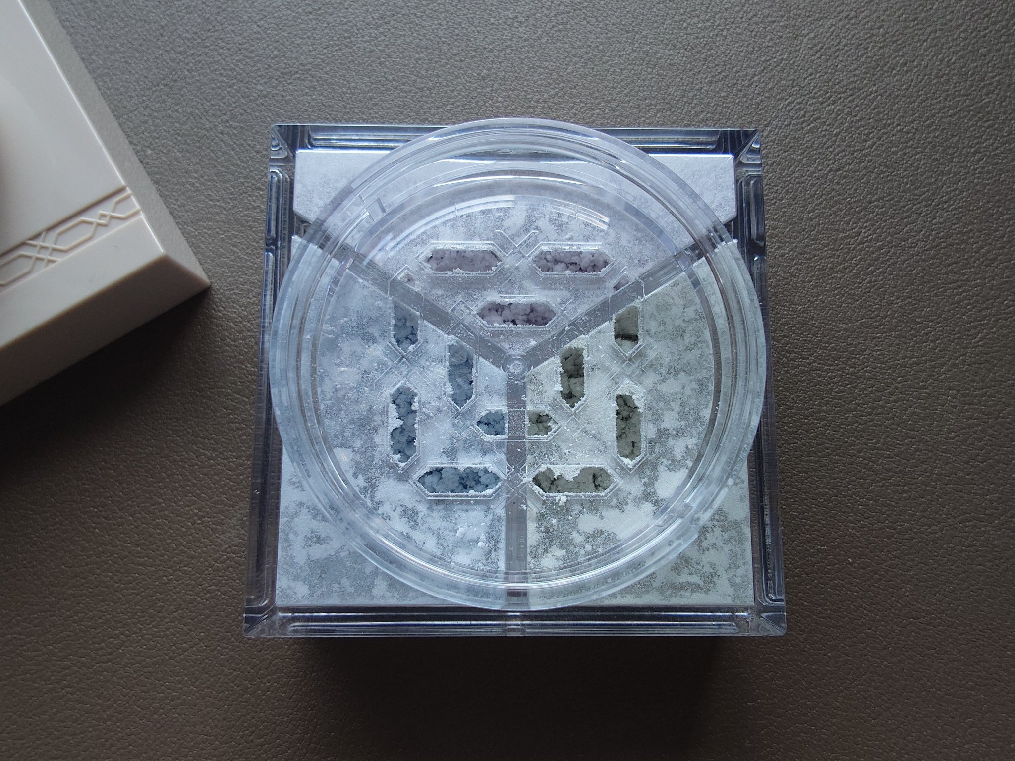 クールインソープは、いちごミルクのような甘くて柔らかい色合いのブルベ向けクールパレット。 01の繊細なホワイトピンクのグリッターが大好きで、下瞼目頭側に入れるとキラっとして可愛かったです。 ブラシよりも指やチップの方がガッツリつくので、濃いカラーを楽しみたいときとツールを使い分けてもいいかなと思います。