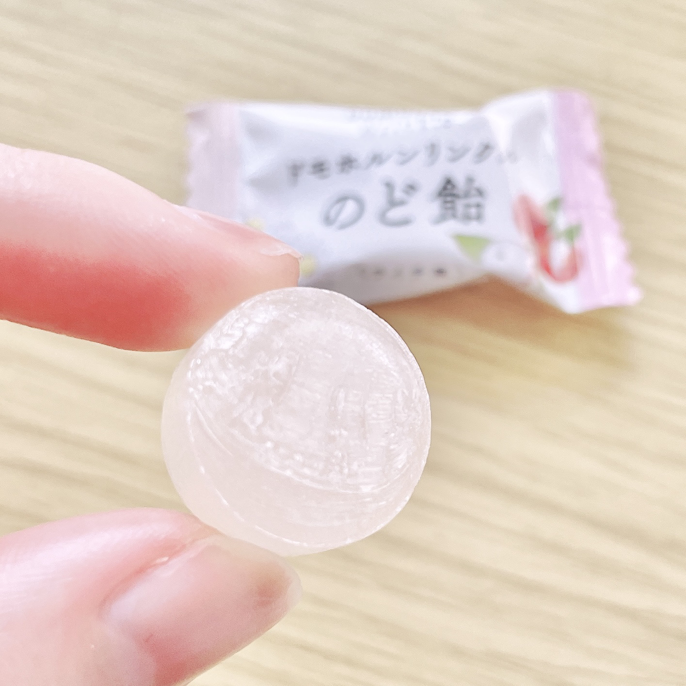 肌だけでなくのどにもうるおいを! 【ドモホルンリンクル】のど飴〈ライチ味〉 価格:270円(税込) まず甘さを感じてからの、ハーブのスーッと感がくる美味しいのど飴♪ まるでスキンケアするみたいに、のどをケアするのど飴🍬🍬 乾燥が気になる季節にぴったり!