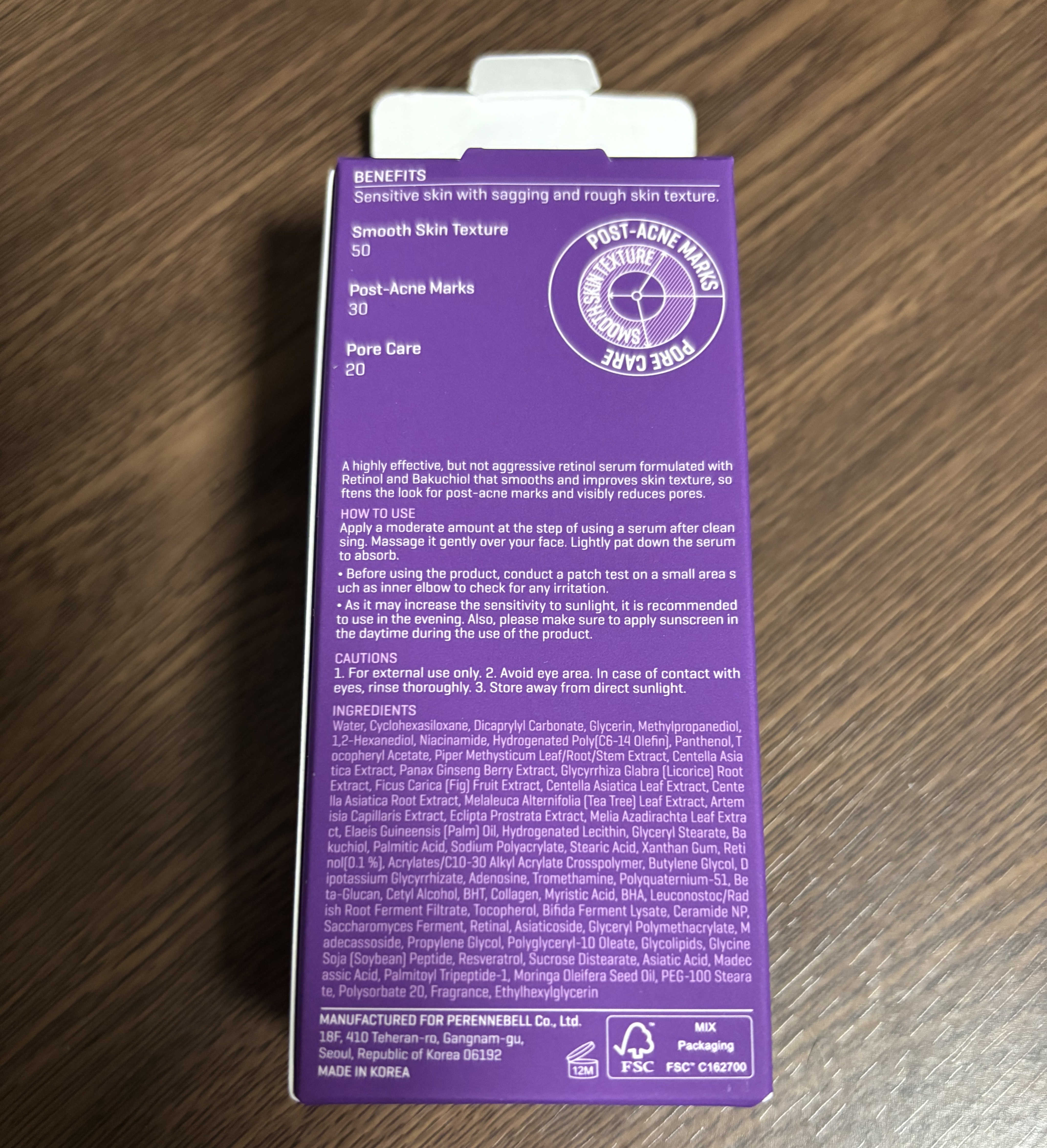 - レチノール*&レチナール**配合の乳液タイプの美容液 年齢を重ねた肌にアプローチし、お顔全体をエイジングケア*** (*整肌成分 **整肌成分 ***年齢に応じたケア) [使用方法] 洗顔後に化粧水やトナーなどで肌を整えた後、適量を手にとり顔全体に塗り伸ばしてください。 1)1~2週目:1日1回夜に、十分な保湿ケアとともに少量を使用してください。(超敏感肌の方は隔日使用をお勧めします。) 2)第3週目以降:肌に適応した後、回数と容量を増やして使用することをお勧めします。 [注意事項] 1)使用前、腕の内側などで刺激がないかどうかをテストしてください。 2)なるべく夜の使用をお勧めします。日中のご使用の際には必ず日焼け止めをご使用ください。 3)レーザー施術後は肌が敏感になることがあるので、使用を避けてください。 4)物理的・化学的な角質除去製品との並行使用は避けてください。 5)適応期間中は皮膚の角質が剥がれ、ひりひりしたり赤みが出たりする等の皮膚刺激が感じられることがあります。(※刺激の度合いが激しい場合は専門医の相談をお勧めします。)